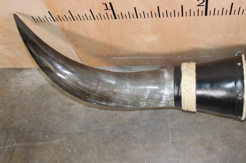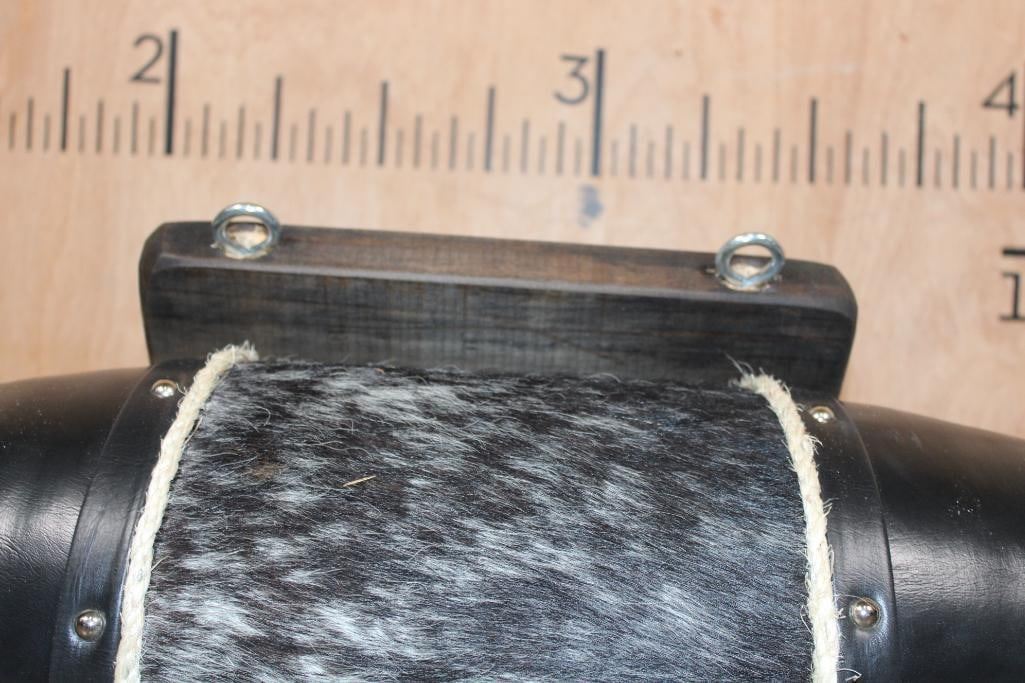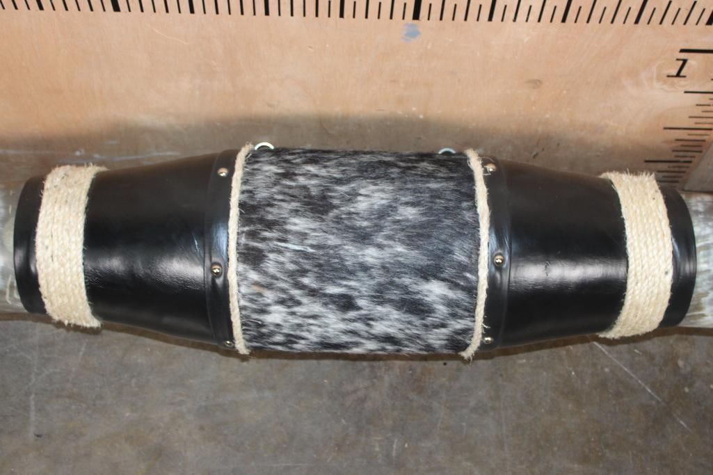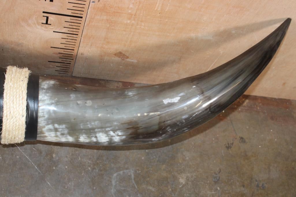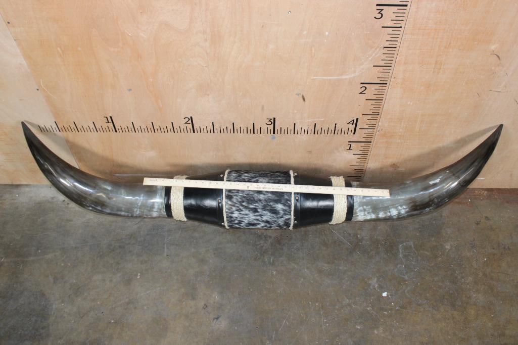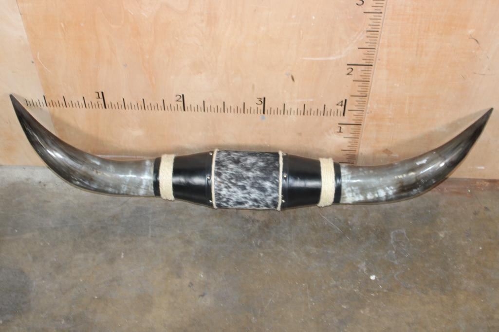 Massive Mounted WATUSI LONGHORN Cross Horns wrapped with Salt and Pepper Cowhide and Leather. They measure 6' from Tip to Tip and 19.25" around each Horn Base. TAXIDERMY