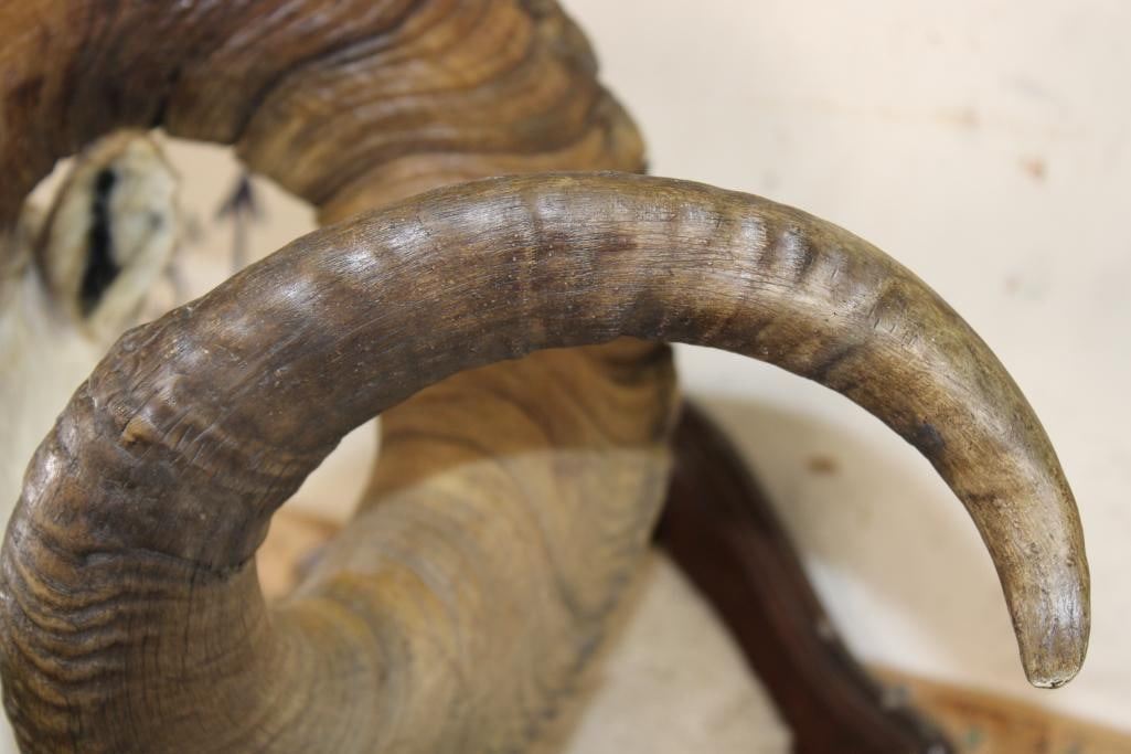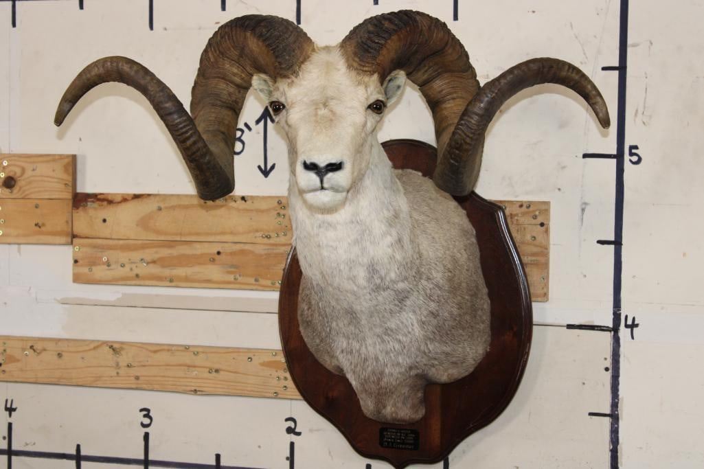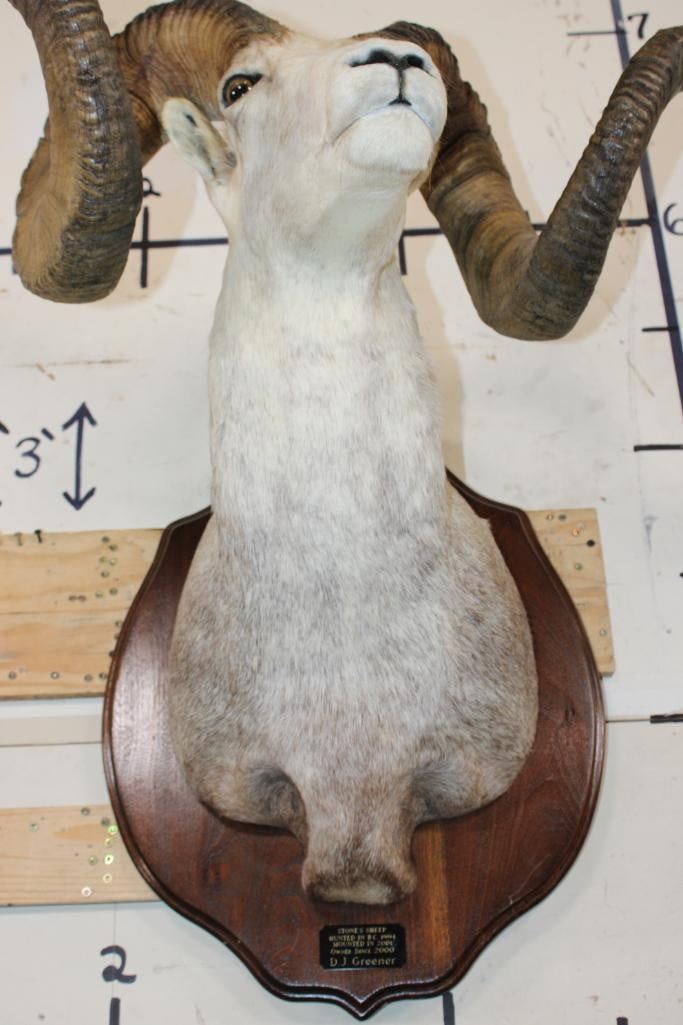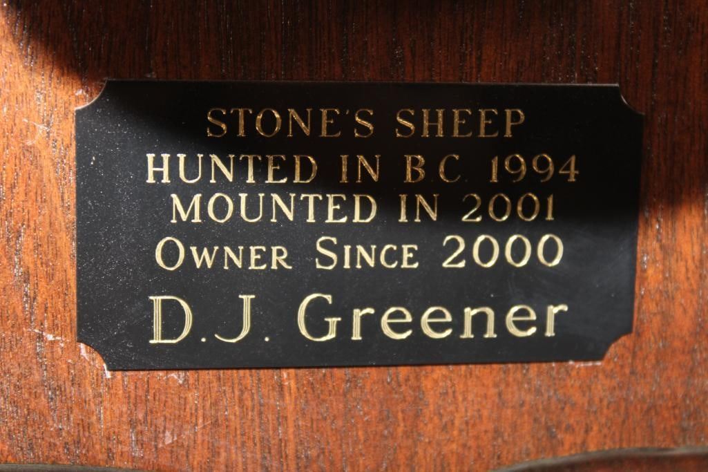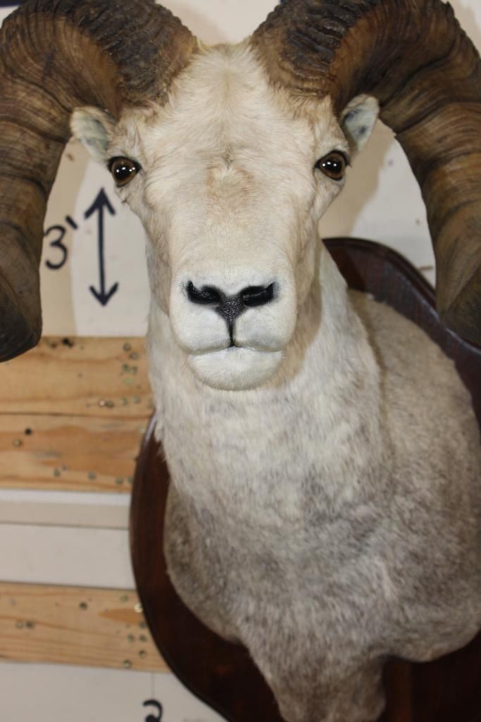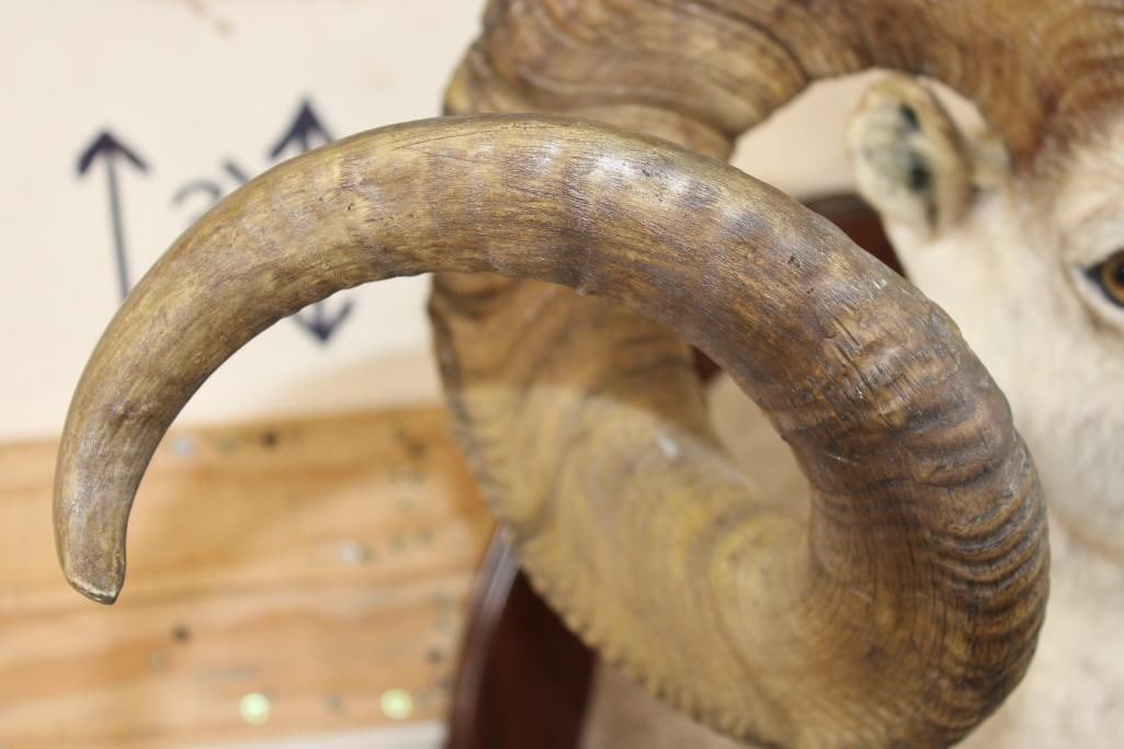 Very Nice and Clean STONE SHEEP Shoulder Mount. The Horns have been modified or lengthened with an additional and approximate 10" added to the end of both horns. The Left Horn measures 47.5" Long and 12" around the Horn Base. The Right Horn measures 47 5/8" Long and 11.75" around the Horn Base. This shoulder mount is in Very Good Condition. TAXIDERMY