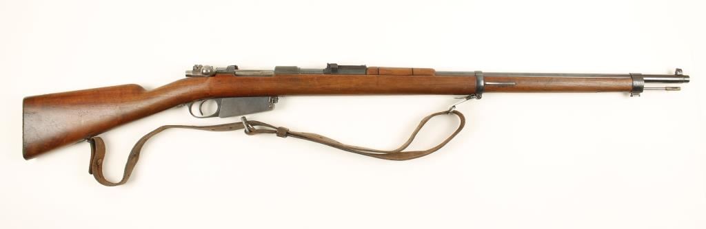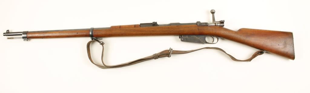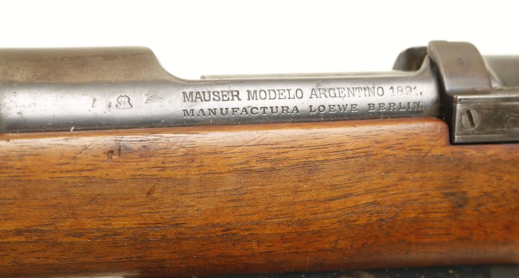 Argentine military blued bolt-action rifle with a 29" barrel and a leather sling. Argentine crest has been ground off. Bluing has some loss on the front barrel band and edge wear over all. Most small parts have either "cap of liberty" or "shaking hands" to denote Argentine ownership at one time. Bottom metal and bolt serial numbers match the receiver but the stock number is different. Butt plate is bare metal with rust stains and dings. Stock has two stampings with "AG" in a shield and one with "RA" (Republica Argentina) in an oval. There is another illegible stamp on the right side of the butt. Many small dings and dents adorn the wood. Bore is frosty with good rifling. Action is good. Condition is good. *Modern Firearm*