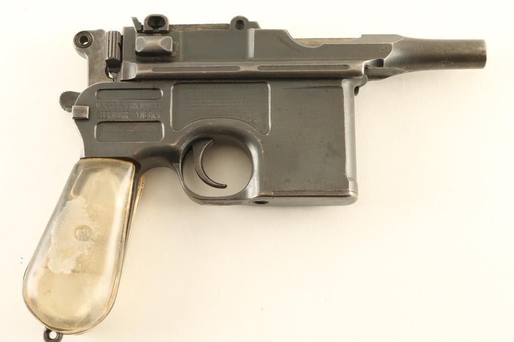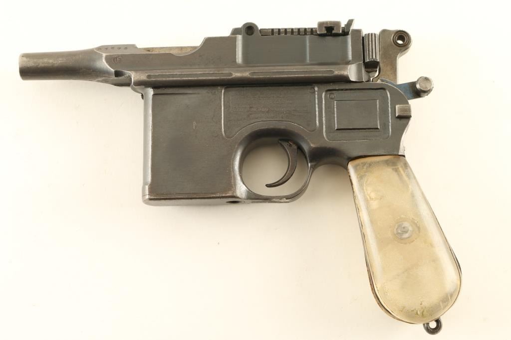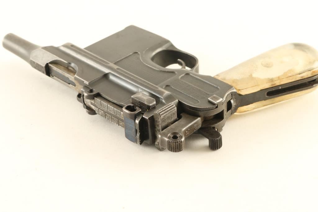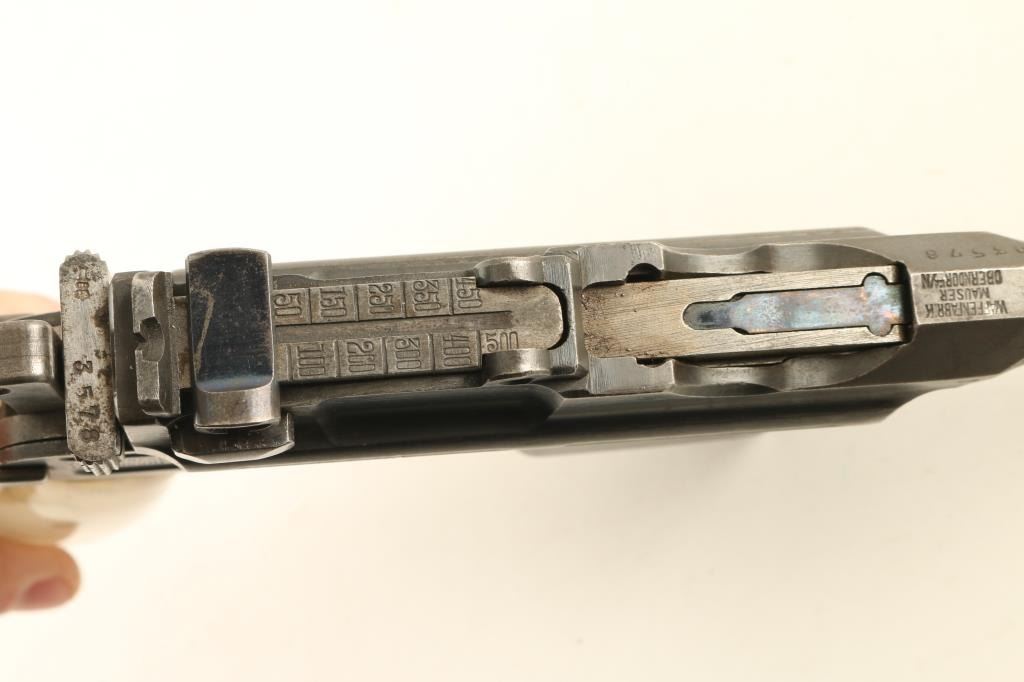 German semiautomatic pistol features blued finish, smooth clear plastic grips, barrel cut down to 2.3", fixed 10 round magazine, single action trigger, manual safety, no front sight, tangent rear sight, lanyard loop at butt (missing ring). Bore is in very good condition, bright with sharp rifling. Retains 80% finish with scratches & dents, bare metal on sharp edges. Grips are good condition, laminated construction for added thickness, appear similar to WWII GI "sweetheart" grips for displaying photos, yellowish and foggy from glue used to assemble each grip. No importer marks observed. Observed numbers match. Markings include crown over "U", crown over "F" on slide, Prussian Eagle on front of magazine. Condition is NRA Very Good - modified (cut barrel) *** C&R Firearm ***