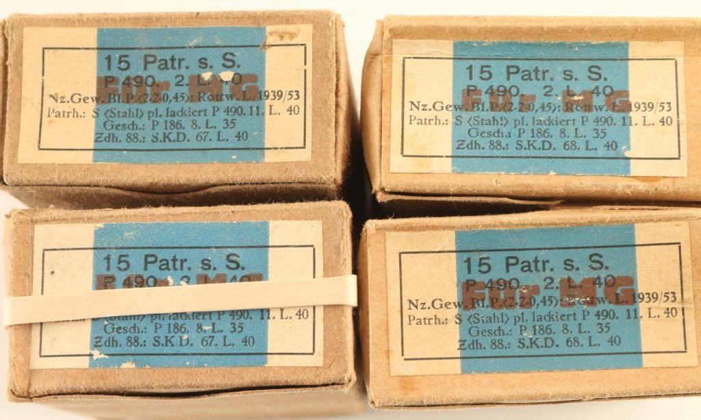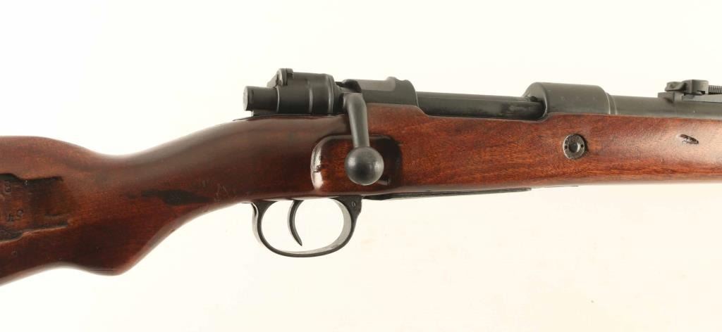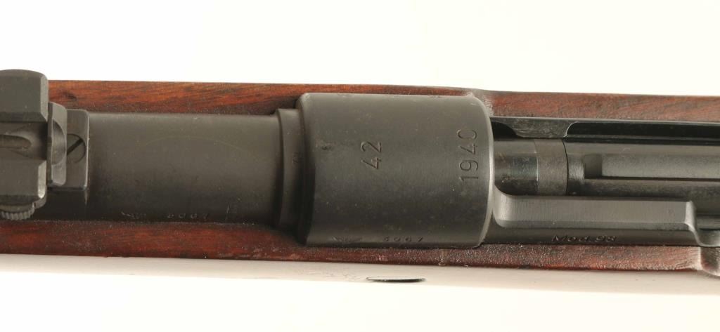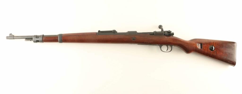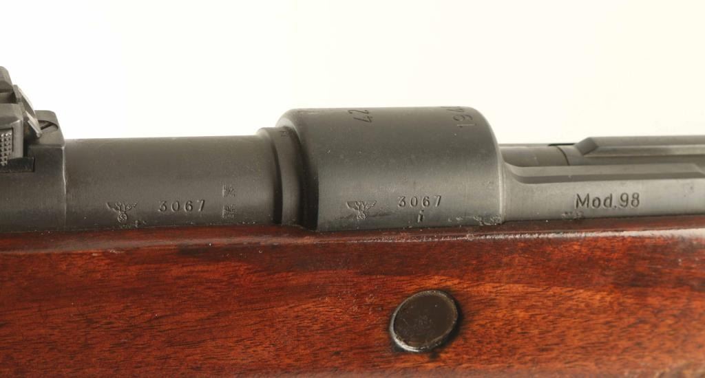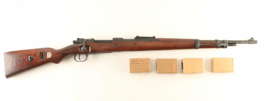 German military bolt action rifle features wood stock, 24" barrel, tangent style sights, turned down bolt handle, manual safety, sling slots. Bore is fair condition, dark & pitted with strong rifling. All metal parts (except buttplate) are re-finished with a dark matte blue. Stock and handguard have been given a thick coating of varnish. Non-matching numbered parts have had numbers ground off before refinish. No importer marks observed. Markings include eagle over WaA655 and eagle waffenamts in many places. Cleaning rod missing. Rear band installed with sling slot on wrong side. Safety needs gunsmith correction - cocking piece will move forward of sear if trigger is pulled while safety is on - subsequently taking the safety off will fire the rifle. Includes four boxes (15 rds each, 60 total) of German WWII production 8mm Mauser ammunition marked for Machinegun use. Condition is NRA Poor - safety repair required *** C&R Firearm ***