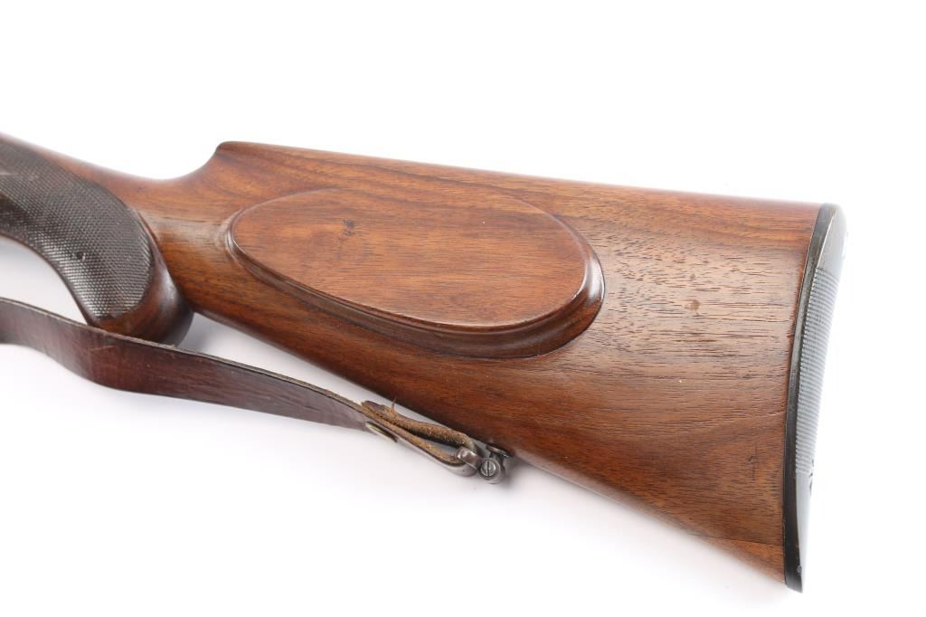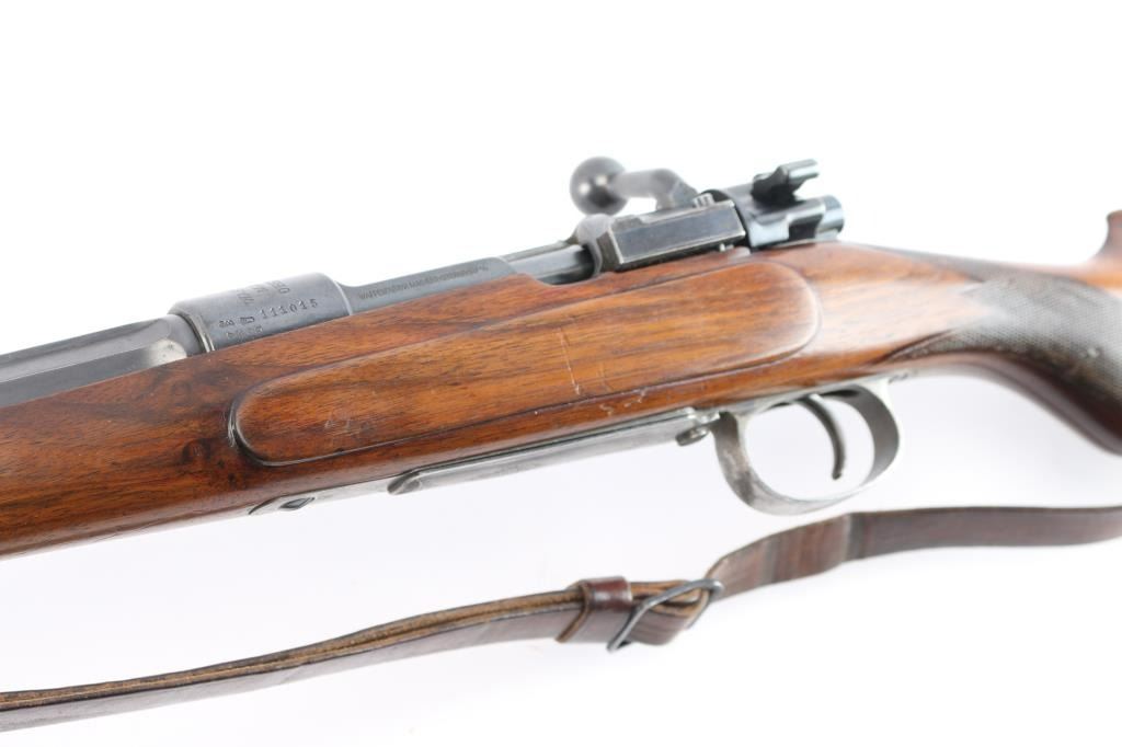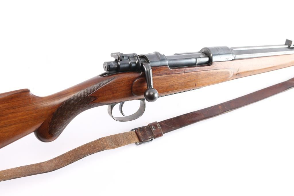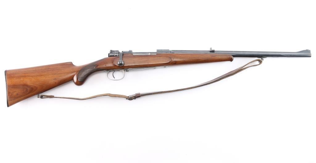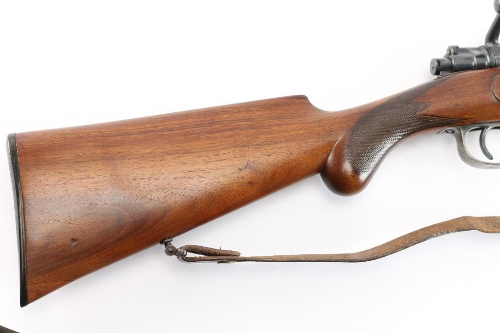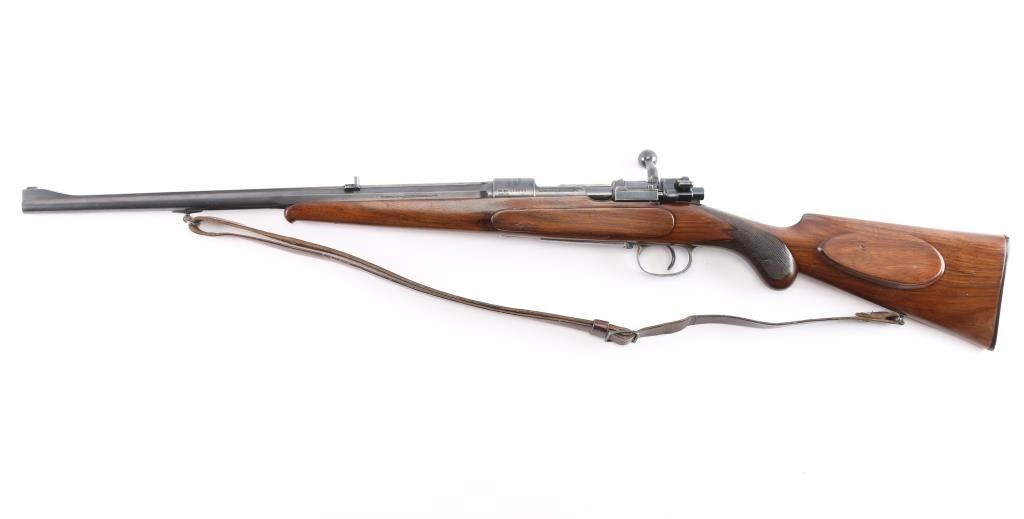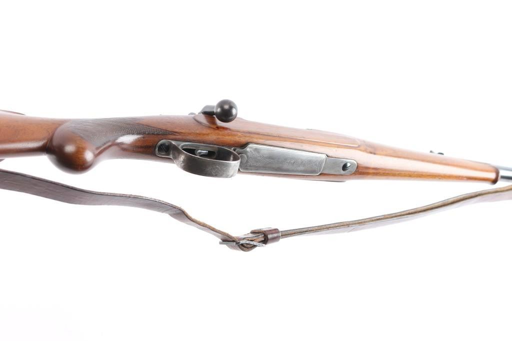 Deluxe quality European styled sporter by Mauser. Features 20" half octagon, half round barrel with full length integral rib, narrow front swivel under barrel, blade front sight, express rear sight with one standing and one falling leaf, checkered push button floorplate release. Walnut stock with splinter forend, schnabel tip, pancake cheek piece with shadow line, narrow rear swivel, side ovals over action, Prince of Wales knob grip with checkered panels. Bore is a bit dark, strong rifling. Retains 85% finish with handling marks. Stock is very good overall with dents, some erosion at edges of checkering, possibly refinished.