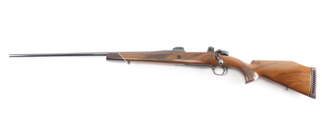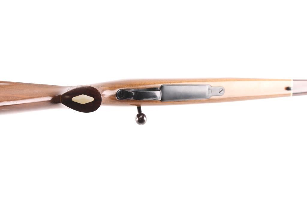 For left-handed shooters. Commercially produced push feed Mauser Model 3000 bolt action rifle in 7mm Rem. Mag. caliber. These rifles were manufactured in Germany by Mauser Werke in Oberndorf from 1971 thru 1974 and brought into the U.S. by Mauser-Bauer Firearms Co. of Fraser, Michigan. They use a Sako type extractor rather than the long Mauser style extractor which in turn makes for a nice smooth action. These rifles did not have sights but were factory drilled for standard commercial scope bases. The tapered barrel on this rifle is 26" in length. Manual safety on the bolt shroud, serrated trigger, hinged floorplate, sling swivel studs, and cocking indicator. The rifle's deep blue finish is about 96% with minor handling wear on the bolt knob, and triggerguard. The checkered Monte-Carlo style walnut stock has contrasting grip cap with bone inlay, and forearm tip,shadow line cheek rest, and vented factory recoil pad. The bore is excellent/bright, action is smooth, receiver has two piece Buehler scope bases installed. Matching serial numbers on receiver, barrel. & bolt.