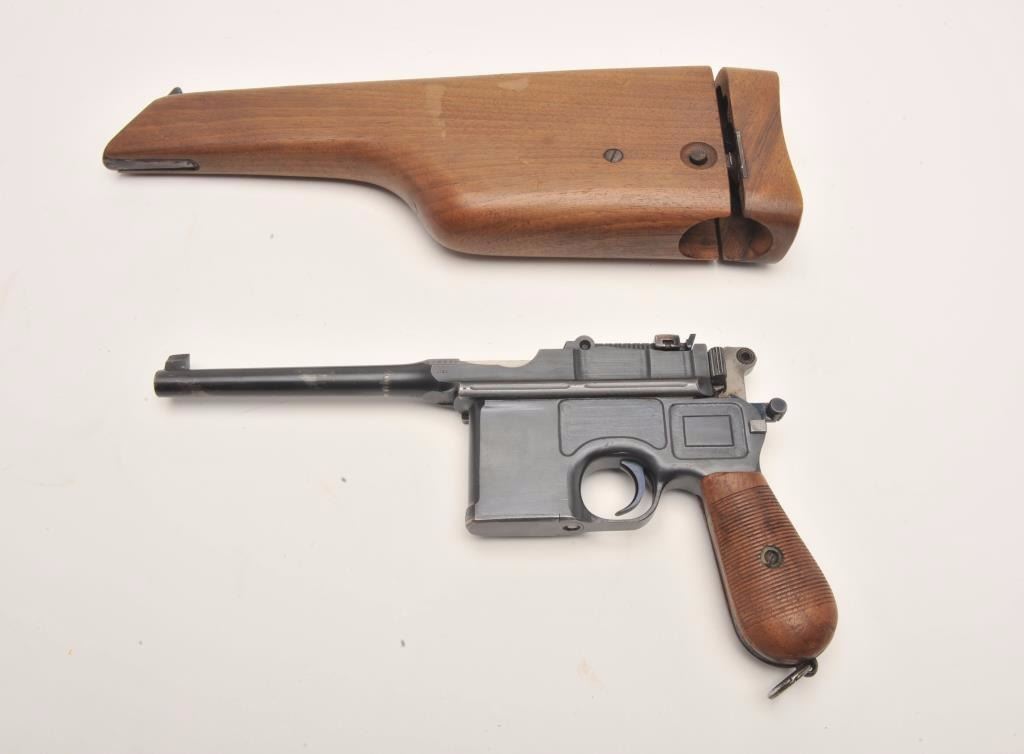 Mauser Broomhandle semi-automatic pistol, 7.65mm caliber, 5.5” barrel, blued finish, wood grips, lanyard ring, S/N 303875, all matching visible numbers, with wood stock/holster, in overall very good +condition showing majority of military finish to metal surfaces, crisp action and markings, good grips, fair + bore; combination stock/holster in very good condition overall. (C&R/PPT). Est.: $1,400-$2,800.