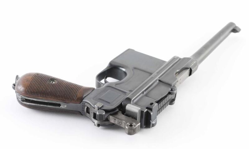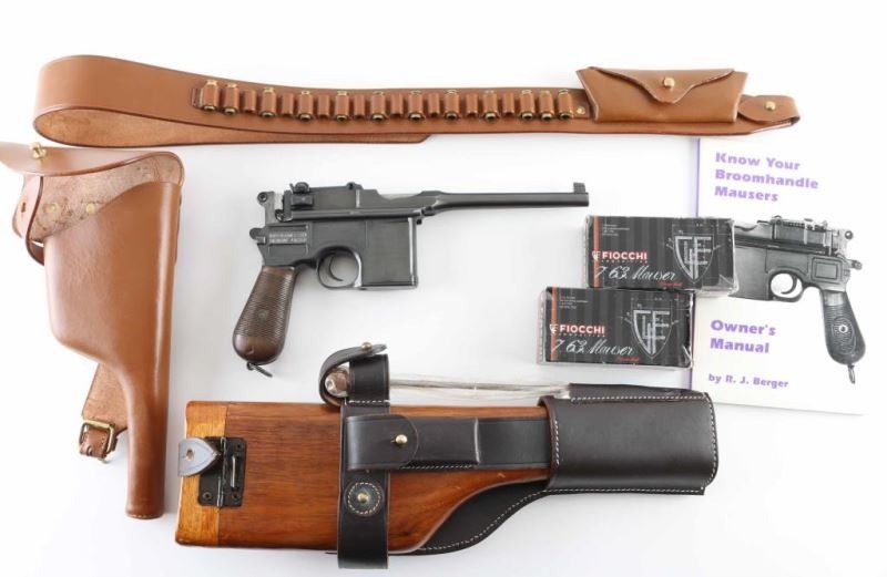 German made single action semi-automatic pistol chambered in 7.63x25mm Mauser. Features blued refinish, 5.5" barrel with step in the contour, tall blade front sight, tangent rear sight graduated to 1,000 meters, integral 10 round box magazine, smooth trigger, early style small ring hammer with NS monogram, manual safety without hole, steel frame with step in the backstrap & fore/aft swinging lanyard loop (loop is a split ring), and two-piece 30-groove wood grips. Observed numbers match. Bore is fair condition, frosted in appearance with eroded appearance to rifling. Pistol exhibits 90% reblued finish, with partial erosion of markings on barrel, signs of dishing on flats and uneven curvature to edges from heavy polishing. Wood grips are good condition, tiny chips out of grooved areas, visible wear to high ridges of grooves. Includes vintage wood shoulder stock that attaches to pistol or serves as a storage case, with excellent condition brown leather hanger straps, belt with cartridge loops, additional soft sided full flap holster, cleaning rod, several stripper clips, manual, aluminum luggage type travel case, two partial boxes of ammo (approx 75 rounds plus some fired brass). Condition is NRA Good+ (refinished) *** C&R Firearm ***