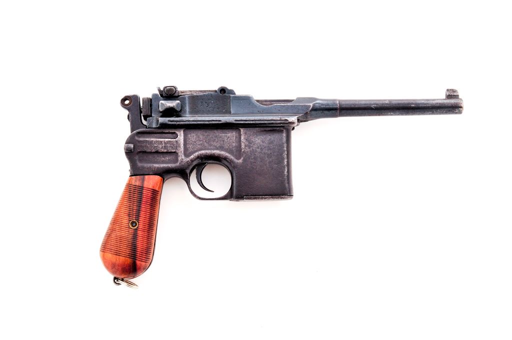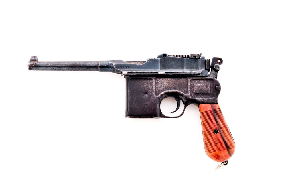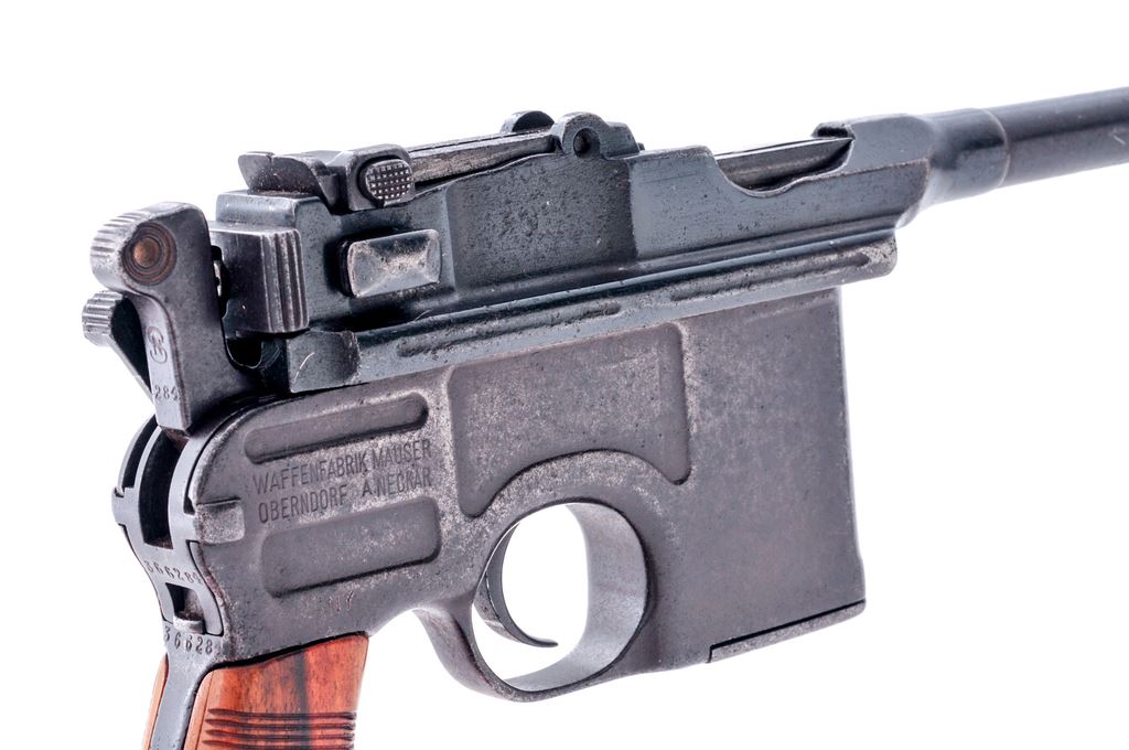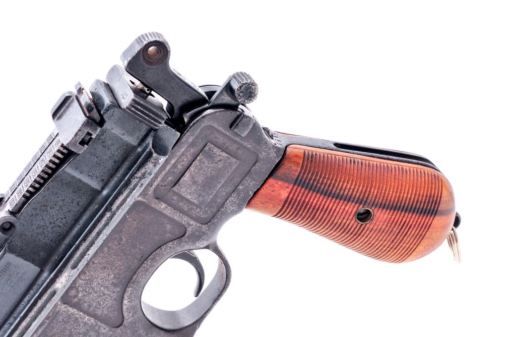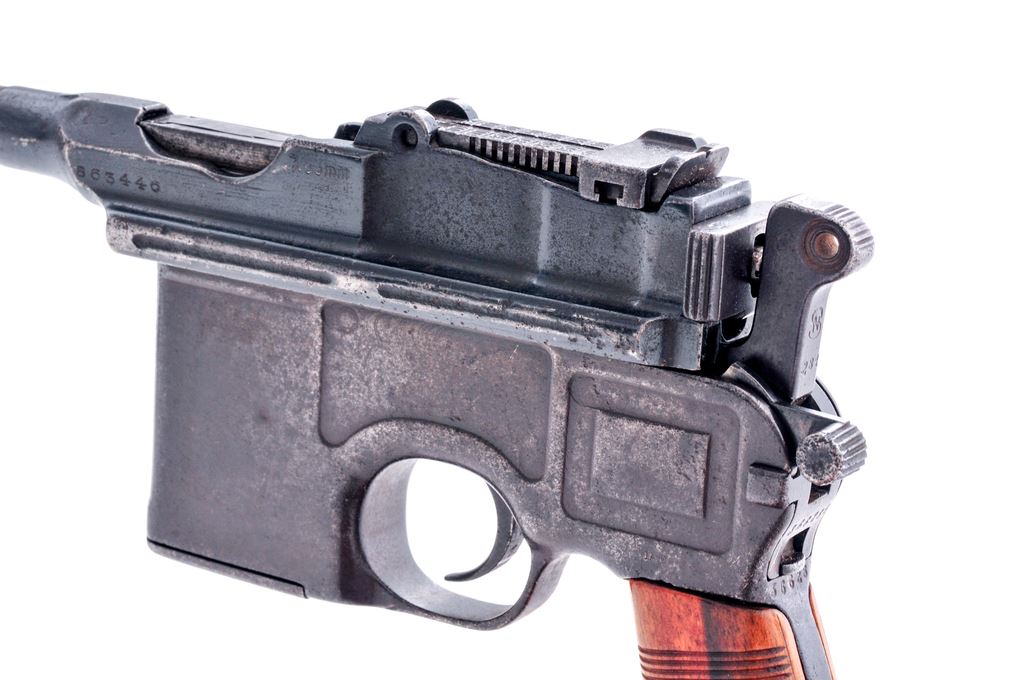 C96 Broomhandle Semi-Automatic Pistol, by Mauser, #366284, 7.63 Mauser cal., 5.25'' barrel, blue finish, grooved walnut grips. Import marked to bottom of barrel. Mixed numbered parts. Condition is fair as probably imported from China in the 1980s, with moderate general pitting beneath a blue finish done at time of importation. Grips are replacements. Action is fair, bore is dark. Est.: $200-$400. (C&R/PPT)