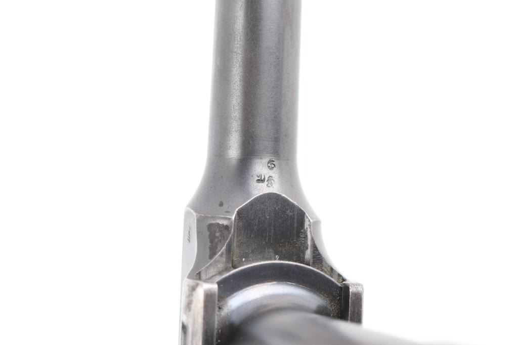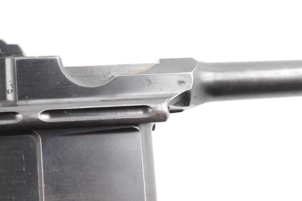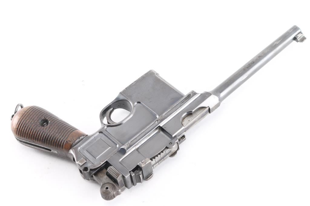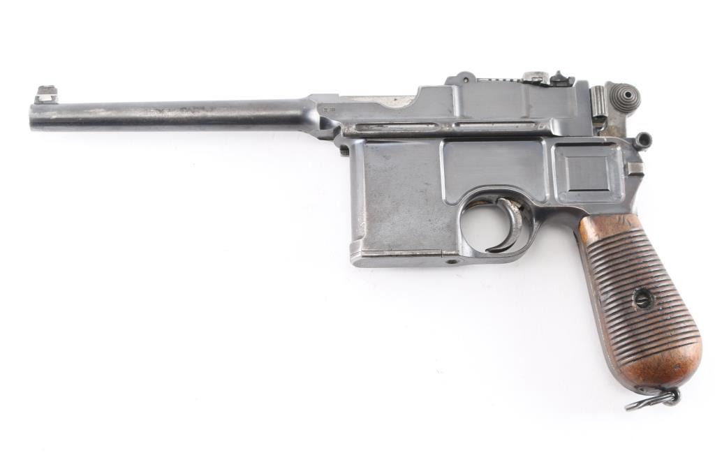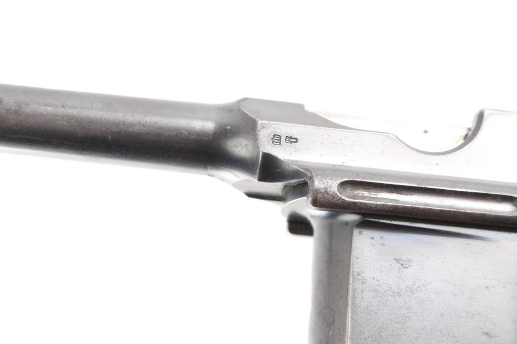 c.1896 Semi-auto pistol marked Westley Richards on sight bar #5667. Fine condition retaining 80% plus original blue with very good wood grips. Minor scratches, mars and loss of finish on sides of BBL from holster or wooden stock. Good and sharp markings with correct small parts and screws. Good mechanically with very good bore showing minor pitting. Dovetailed bead top blade front sight (no bead) Note, similar to one purchased in London by Winston Churchill that was lost in South America. (Westley Richards may have information on this number.) Condition is NRA Fine.*** Antique Firearm ***