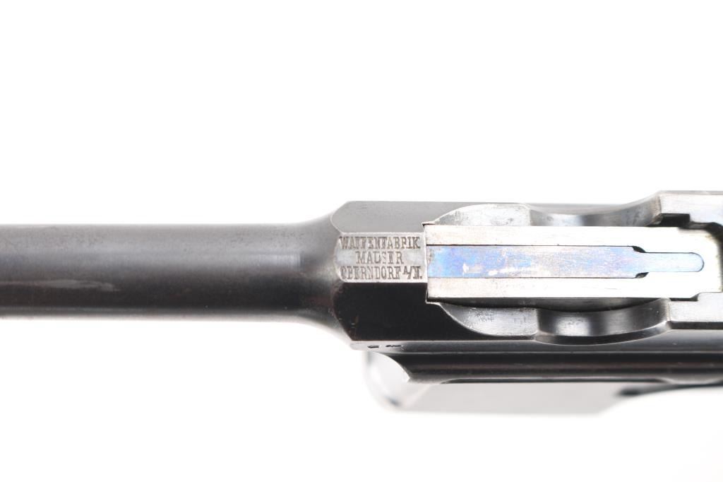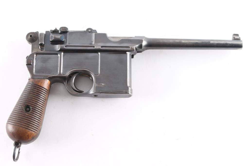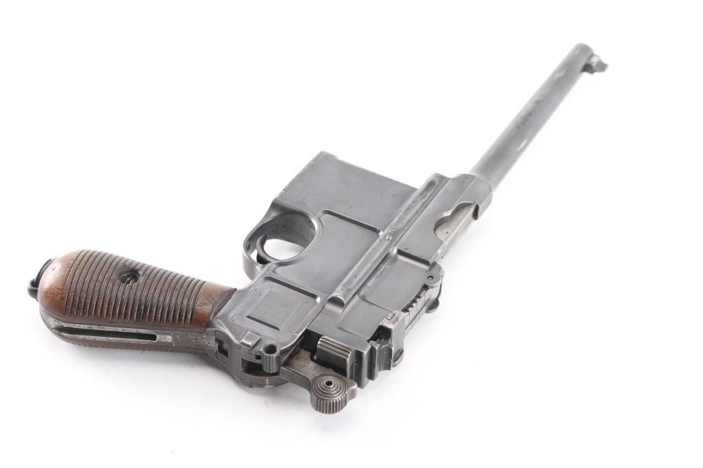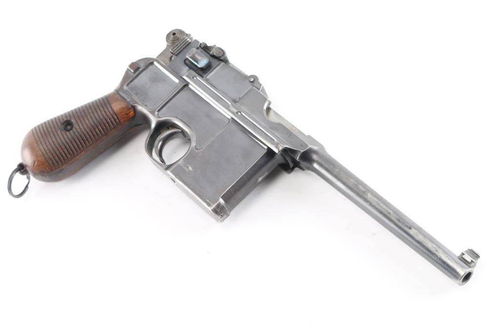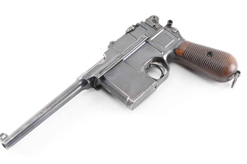 c.1896 Semi-auto pistol marked Westley Richards on sight bar #5667. Fine condition retaining 80% plus original blue with very good wood grips. Minor scratches, mars and loss of finish on sides of BBL from holster or wooden stock. Good and sharp markings with correct small parts and screws. Good mechanically with very good bore showing minor pitting. Dovetailed bead top blade front sight (no bead) Note, similar to one purchased in London by Winston Churchill that was lost in South America. (Westley Richards may have information on this number.) Condition is NRA Fine.*** Antique Firearm ***