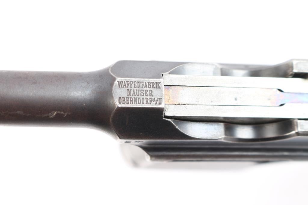 'Broomhandle' German commercial semiautomatic pistol. 'Cone Hammer'. Manufactured 1897. Features blued finish, hand checkered wood grips over the grooves, period done. 5.5" barrel, blade front & tangent rear sights, 50-500 meters, fixed 10 round magazine, manual thumb safety, lanyard stud (missing the ring) at butt. Backstrap slotted for shoulder stock. Bore is good condition,bright, strong rifling, lightly frosted. blued finish is about 70%, dulled somewhat with bare metal on high spots, handling/edge wear, some very light scattered pin-prick pitting. Grips are very good condition. Markings are crisp/clear, including "Waffenfabrik Mauser Oberndorf a N" on top of chamber flat, crown over 'U' on left barrel extension, 'antler' proof on right barrel extension (1897-1899) and German proof marks on the underside of barrel. Mauser banner not present. Serial numbers match where observed including stamped on the inside of both grip panels. Serial number not on barrel, correct for this time period. Action is smooth/crisp.