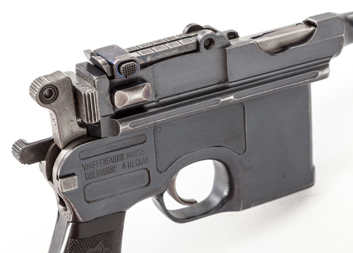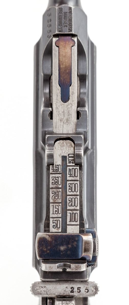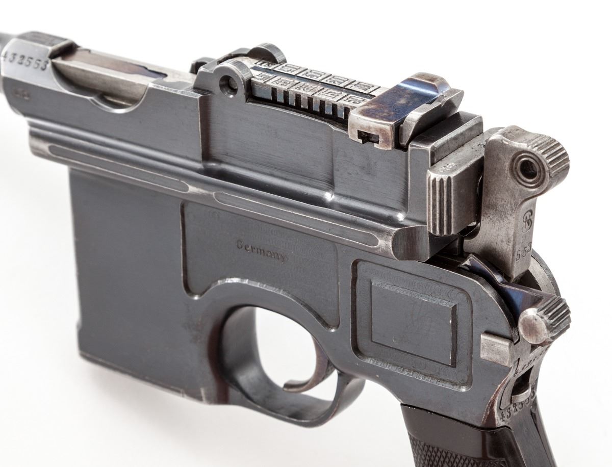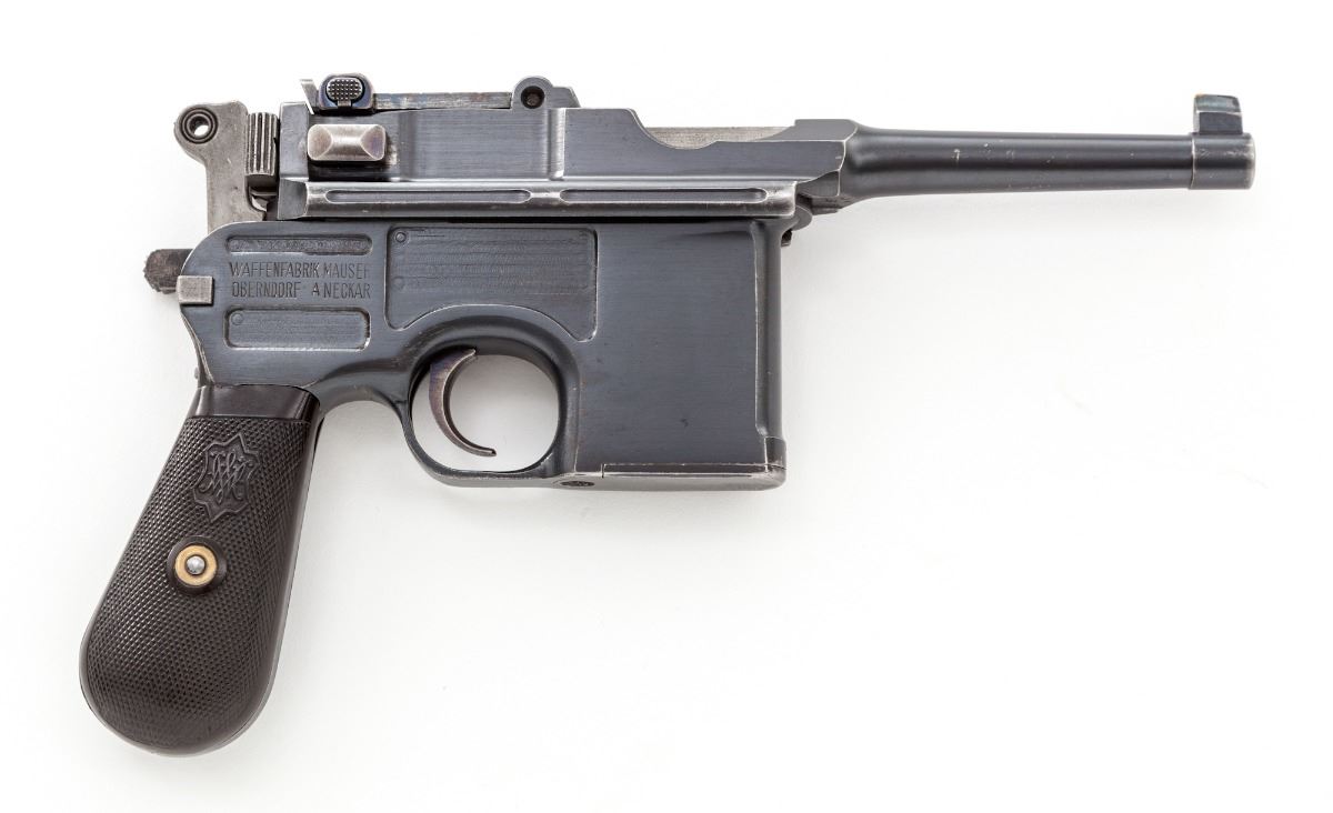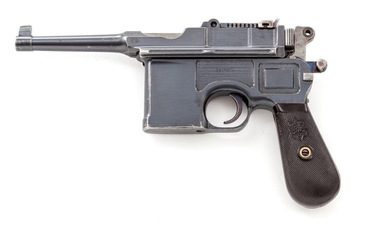 Mauser C96 French Gendarme Bolo Semi-Automatic Pistol, #432553, 7.63mm Mauser cal., 4'' barrel, blue finish, checkered hard rubber grips, with rear sight calibrated 50-500, and ''Germany'' stamped in the left front frame panel indicating commercial sale. Condition is fine to near excellent retaining approx. 94% factory blue. Grips with mild flattening near butt. All visible matching numbers. Action is good, bore with mild frosting. Est.: $1,500-$2,000. (C&R)