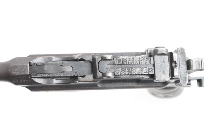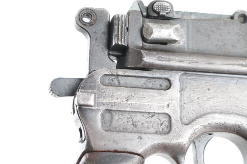 German semiautomatic pistol imported by CAI, St Albans VT. Features blued finish, grooved wood grips, 5.5" barrel, blade front & tangent rear sights, fixed 10 round magazine, manual safety, lanyard ring at butt. Bore is poor condition, rusted out with traces of rifling visible. Metal surfaces are brown color patina, with bare metal on edges, areas of pitting throughout. Markings are eroded, and all numbers are mismatched. Grips are poor to fair condition. Lanyard ring is a bent piece of thick wire. Condition is NRA Fair *** C&R Firearm ***