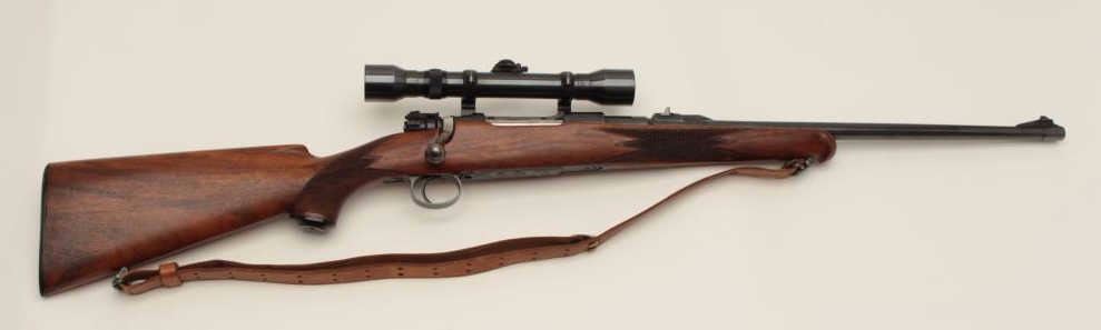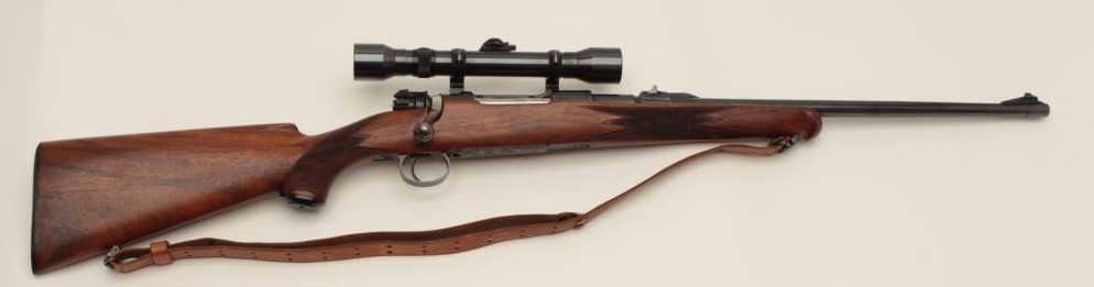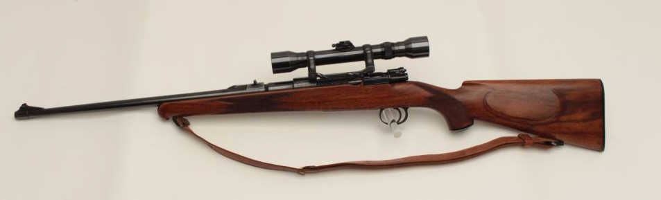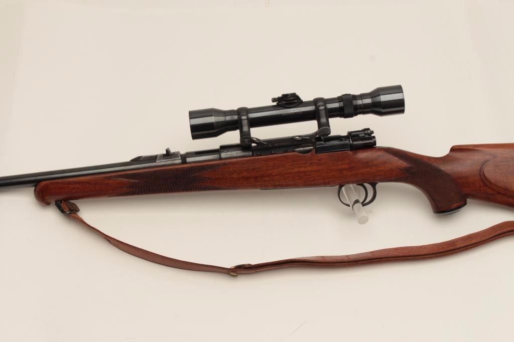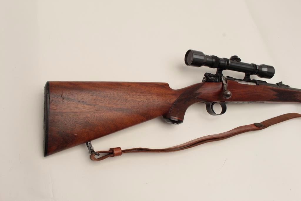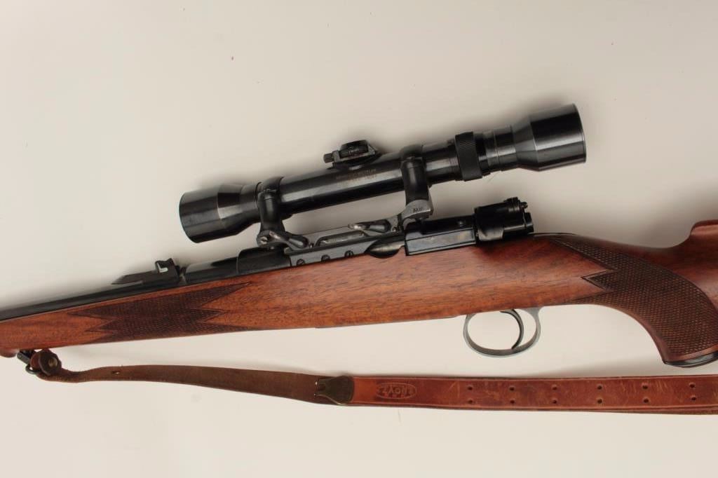 Mauser Commercial bolt action rifle, 7mm caliber, 22” barrel, blued finish, checkered wood stock with Boyt leather sling, S/N B48154, mounted with a Hensoldt scope with fine optics. This rifle is in overall verygood to fine condition with a fine bore, crisp action, sharp markings and overall fine stock. (C&R/PPT). Est.: $700-$1,400.