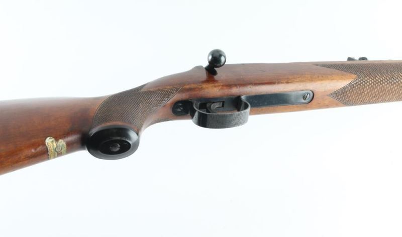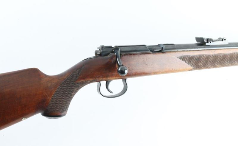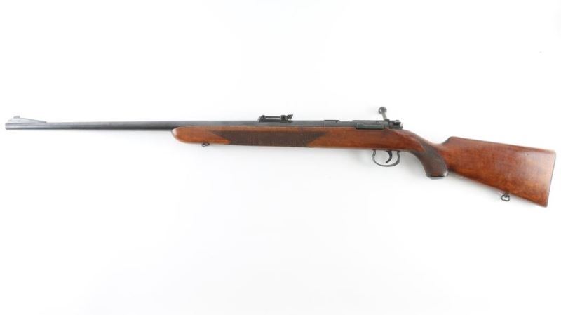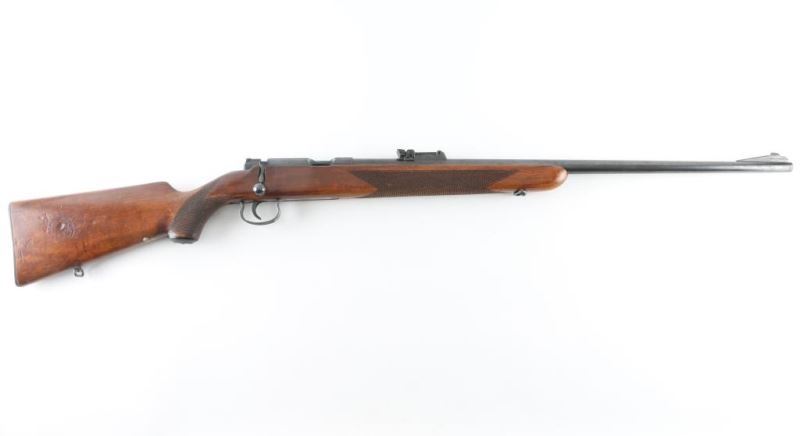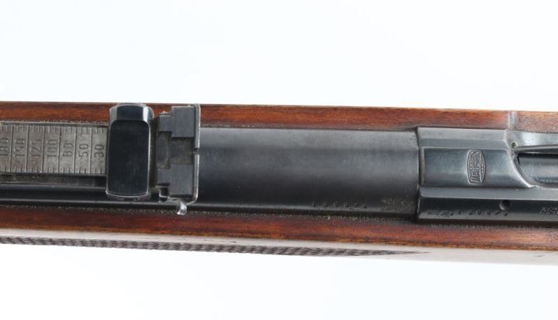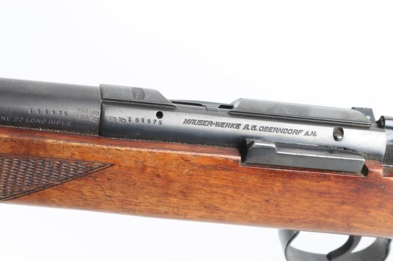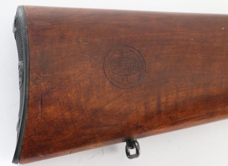 Pre-War, German single shot bolt action rimfire rifle in 22LR. Action has many features of the 98 Mauser on a smaller scale. Features blued finish, wood stock, approx 26.5" barrel, manual safety, grooved receiver for scope mounting, sling swivels, blade front sight, tangent rear sight with elevation slider. Rear sight has numbered adjustment positions (30 - 200) indicated. Bore looks great. Metal finish on receiver and barrel look good with very few signs of use and only minor blemishes. Wood looks good but used with several dents and dings that should steam out for the most part should you wish. Checked at wrist and wrap around checkering on forearm. Pistol grip with black plastic grip cap and plastic "Mauser" butt plate. Marked "D.R.P.D.RG.M" on right of barrel for "Deutsches Reichspatent Deutsches Reichs-Gebrauchsmuster" which roughly translates as "Registered Patent". Mauser banner on receiver. Stock has a "MAUSER" cartouche on right butt. No import marks observed. Condition is NRA Very Good. C& R Firearm