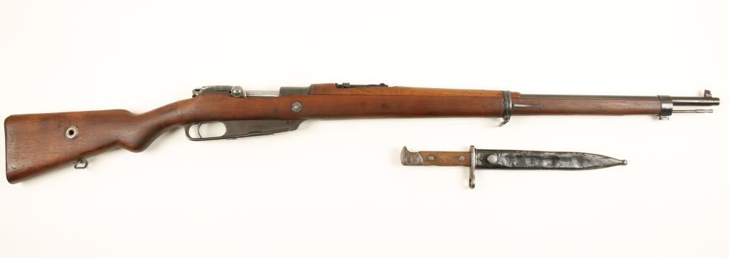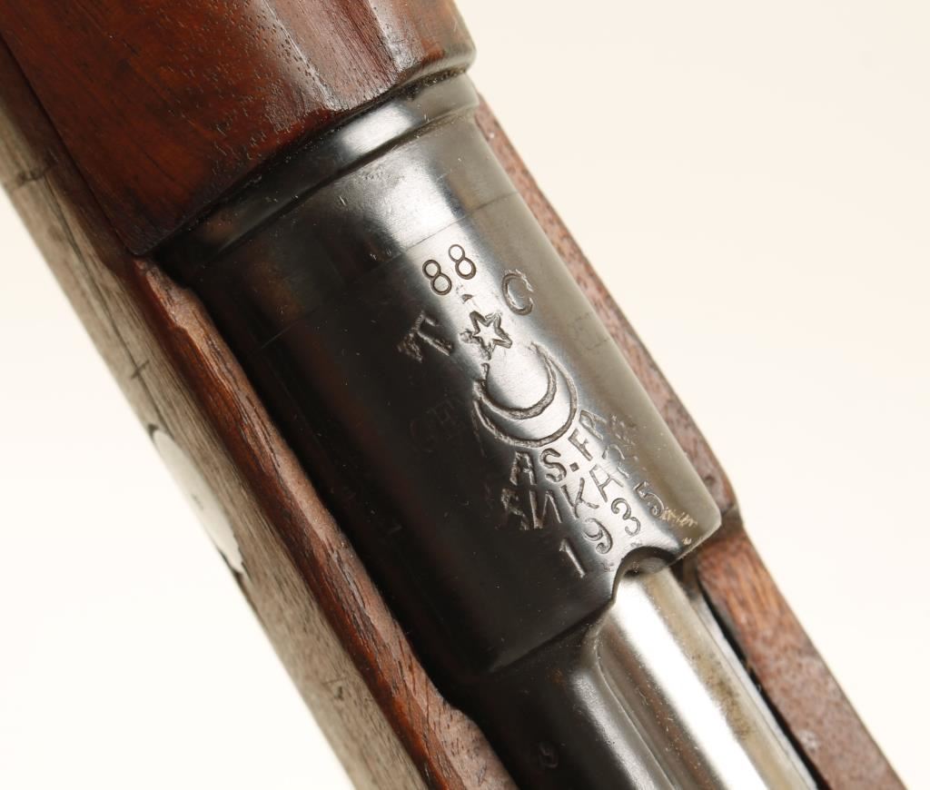 Blued Turkish military bolt-action rifle with a 29" barrel;, bayonet and scabbard. Breech stamped Ankara over "Loewe Berlin" with date of 1935. Bluing is in good shape with some light pitting. Wood stock has a few dings, scrapes and scratches. Bore is dark with good rifling. Action is good. Condition is good as arsenal refinished. *Modern Firearm*