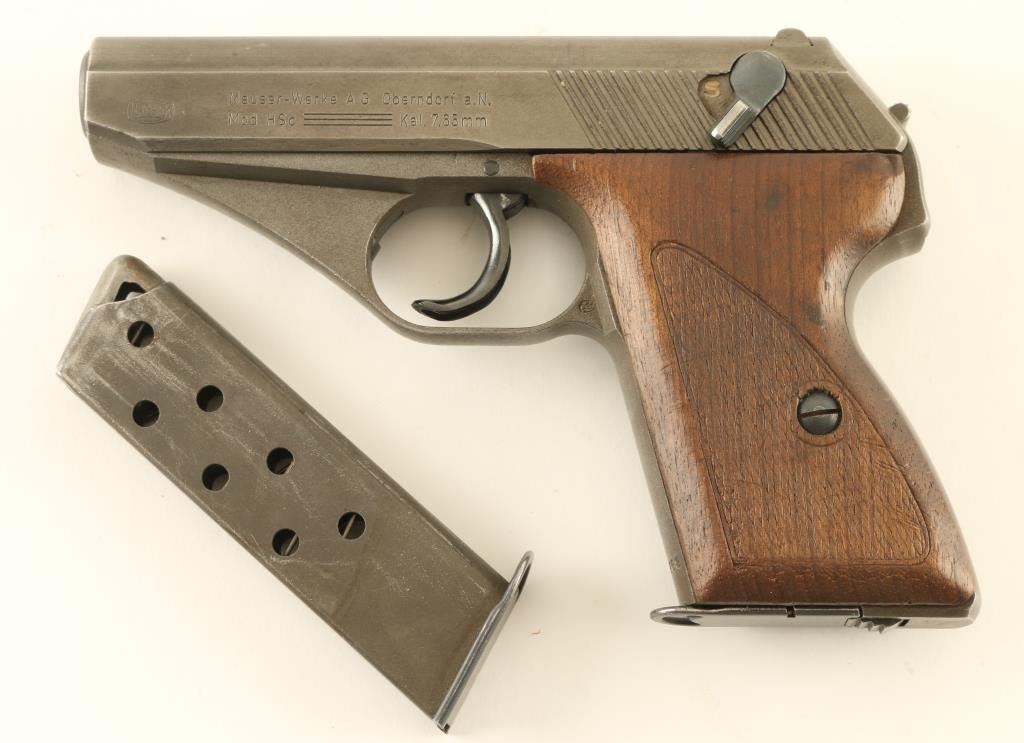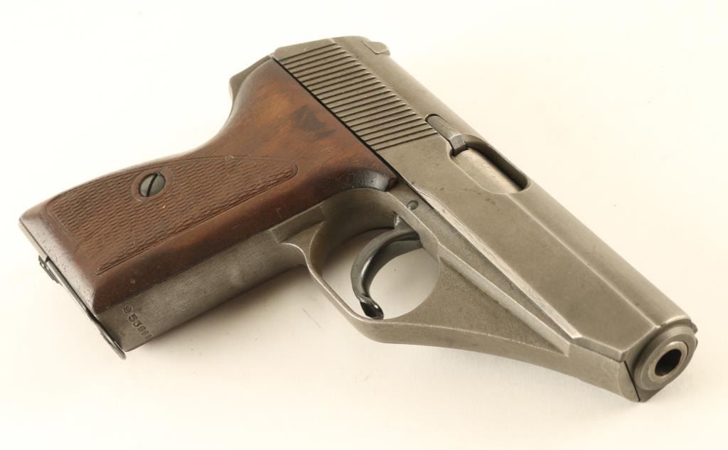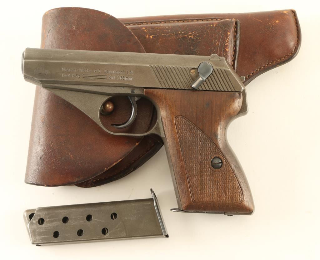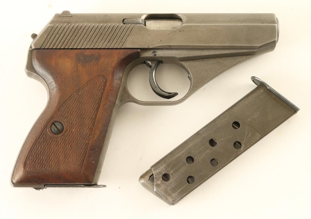 German semiautomatic pistol made under French Occupation after the end of WWII. Features gray phosphate finish, wood grips, 3.25" barrel, fixed sights, slide mounted safety, double,single action, heel magazine release. Bore is very good condition. Metal retains 90% finish, some bare metal on safety and on sharp edges. Grips are good condition, some dents, checkering is worn. Markings include "WR" mark on left rear of triggerguard. No import marks observed. Includes brown leather full flap holster and spare magazine (2 mags total). Condition is NRA Very Good *** C&R Firearm ***