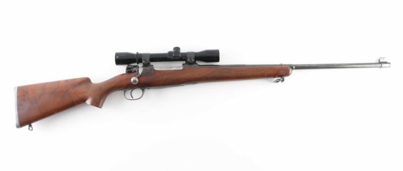 Vintage bolt action sporter built from a surplus military Mauser. Features re-blued finish, wood stock with right hand cheek piece, 24" stepped profile barrel, blade front sight in barrel band, no rear sight, receiver bridge drilled & tapped for sight (not installed), two piece Weaver type bases affixed to receiver top, sling swivels, aluminum buttplate, swept bolt handle, low swing safety. Mounts a Japanese made Top Deluxe 4x32mm scope, fair condition, slightly cloudy view, fine crosshair. Bore is good bright condition with strong rifling. Metal surfaces retain 90% older reblue, turning brown, showing a slightly rough surface texture underneath. Stock is good solid condition, fancy figured, with scuffs and scratches. Includes black nylon buttstock shell carrier. Condition is NRA Very Good as reworked *** C&R Firearm ***
