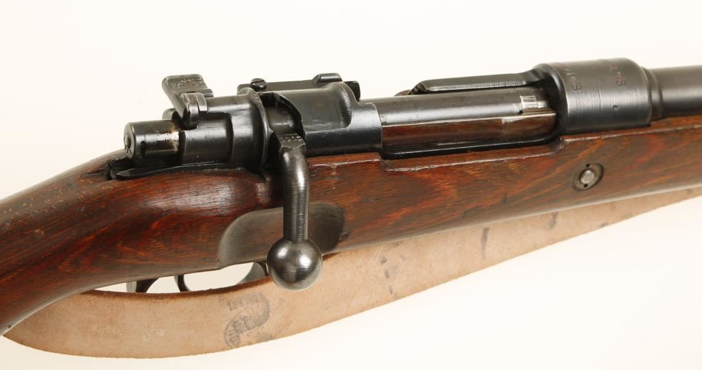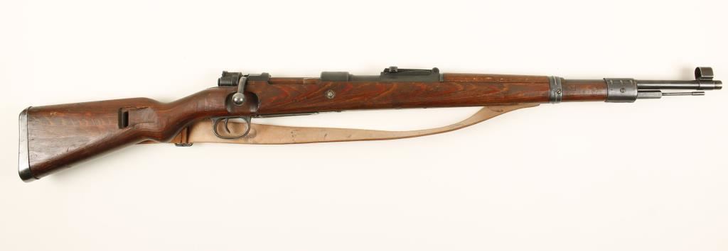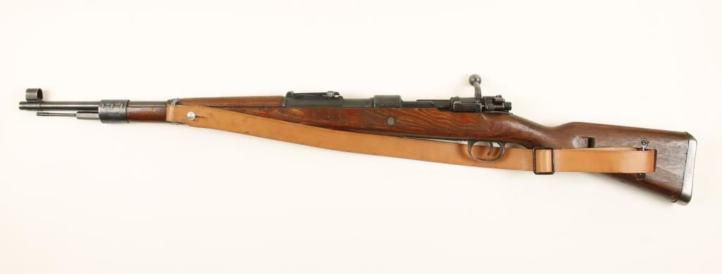 German military blued bolt-action rifle with a 24" barrel and a leather sling. Marked "SVW MB" for manufacture at Mauser Oberndorf in 1945 under French supervision. Metal finish is good with edge wear. All visible serial numbers match. Many stamped and welded parts. Wood has dings and dents and it has 2 ways to secure a sling on the butt. Bore is frosty with rifling. Action is fine. Condition is good. *Modern Firearm*