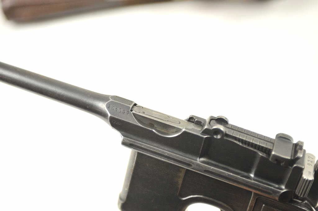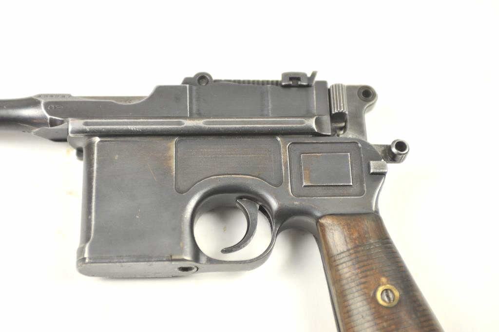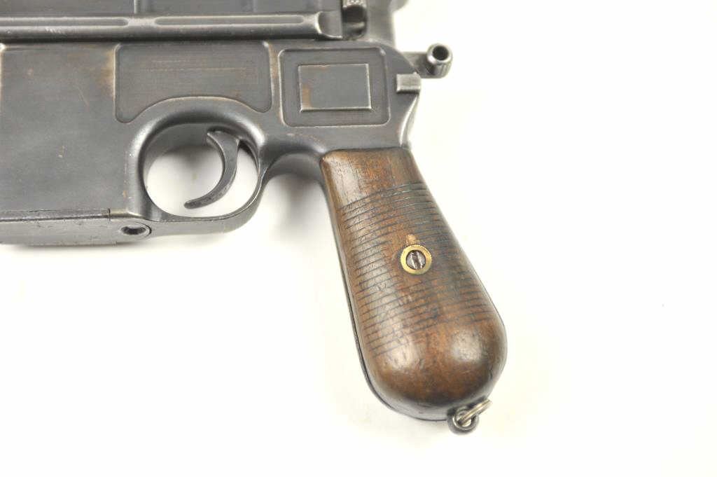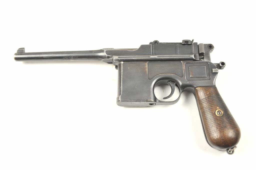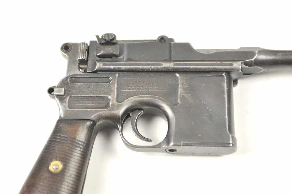 Mauser Model 1896 .30 caliber (7.65mm Mauser), semi-automatic pistol with stock-holster, leather carrier, take down tool and two stripper clips. The pistol retains 50-70% original thinning and toningblue finish with minor scratches and normal aging #254927. Good markings, minor scratches. Grips good but worn. Action is good and the bore is fair to good with erosion showing wear. The stock is a goodreproduction and the carrier shows 1916 date and maker’s mark in Berlin. Est.: $1,400-$2,800. (C+R/PPT).