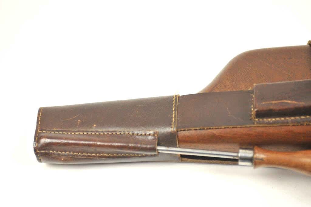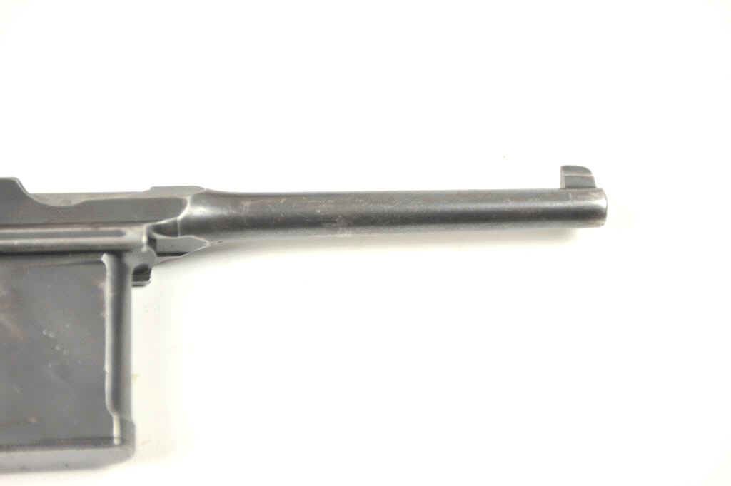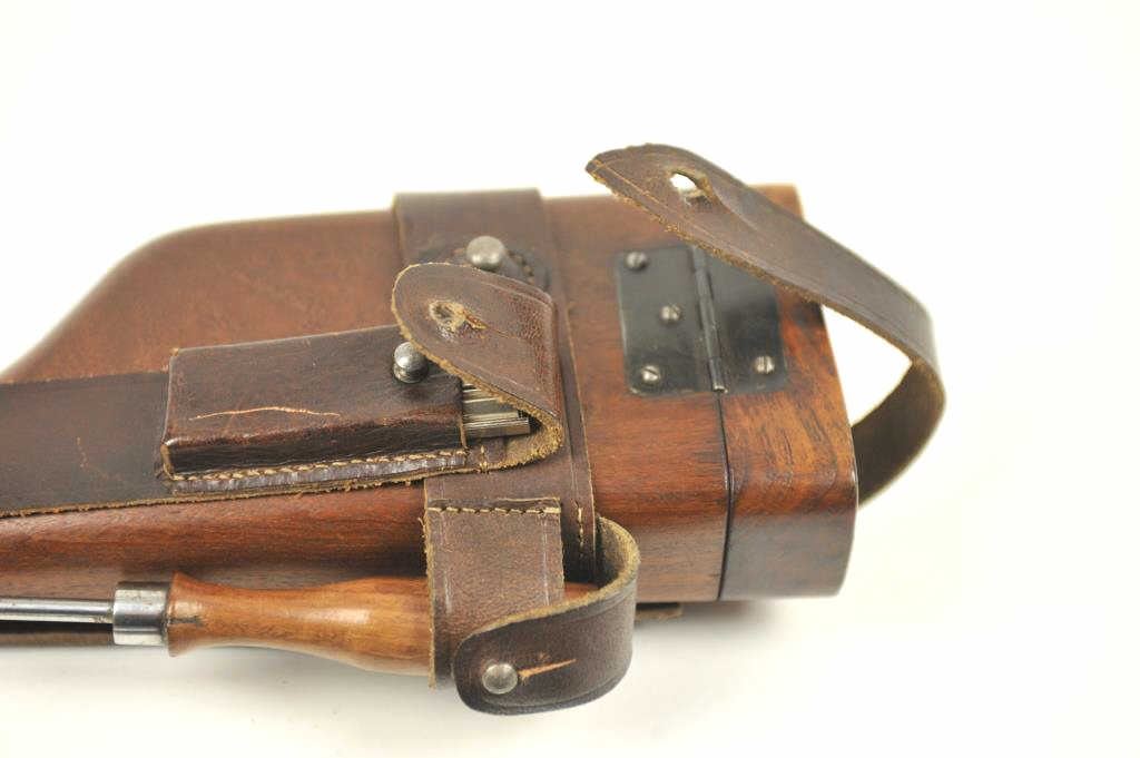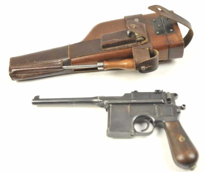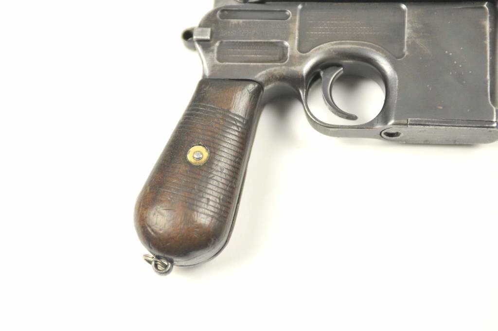 Mauser Model 1896 .30 caliber (7.65mm Mauser), semi-automatic pistol with stock-holster, leather carrier, take down tool and two stripper clips. The pistol retains 50-70% original thinning and toningblue finish with minor scratches and normal aging #254927. Good markings, minor scratches. Grips good but worn. Action is good and the bore is fair to good with erosion showing wear. The stock is a goodreproduction and the carrier shows 1916 date and maker’s mark in Berlin. Est.: $1,400-$2,800. (C+R/PPT).