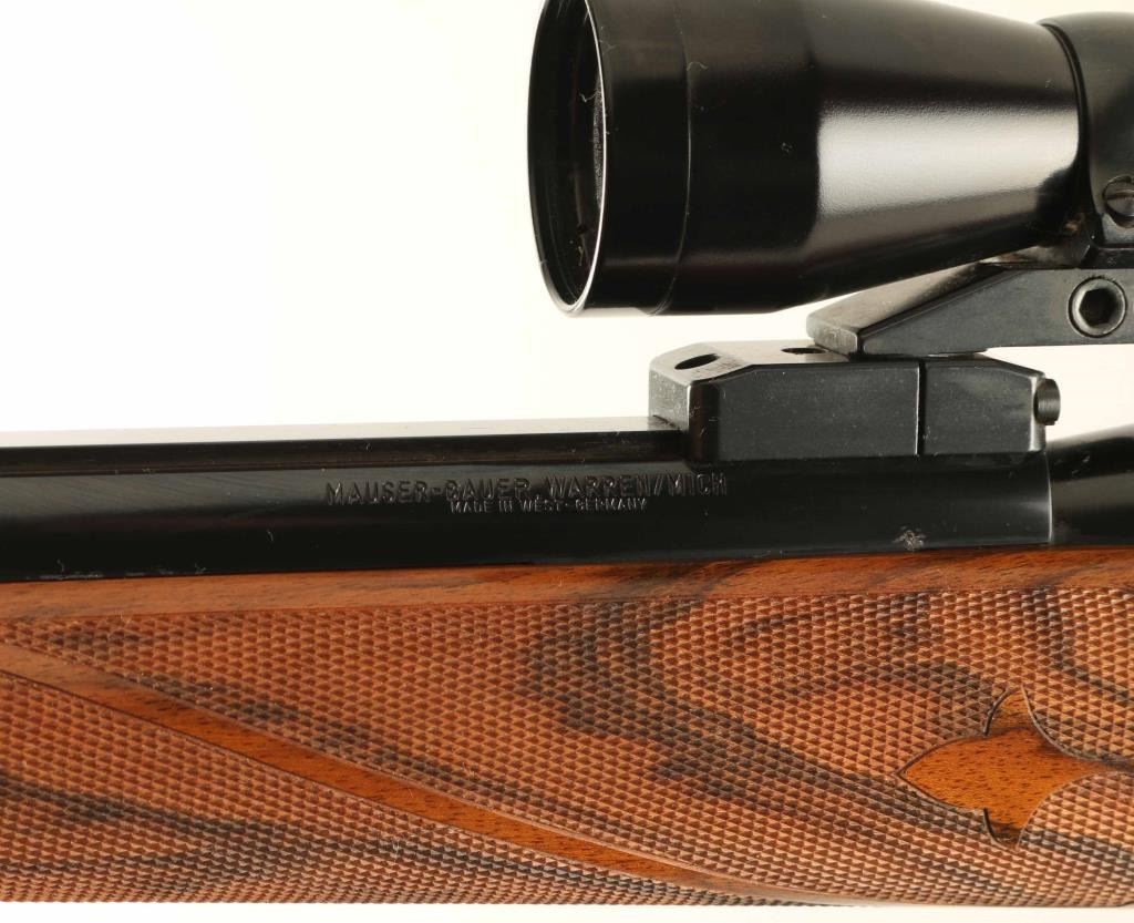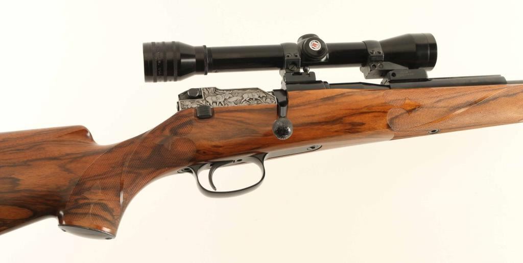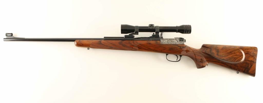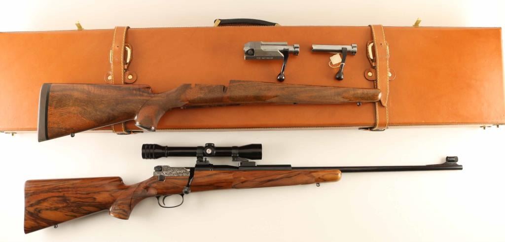 SN: G25712 Fantastic factory engraved bolt action sporting rifle chambered in 7mm Remington Magnum, manufactured in West Germany circa 1970's. The model 66 utilizes a unique telescoping short action with a sliding breech block. Imported by Mauser-Bauer of Warren, M.I. with import stamp on the barrel. Features a blued finish, 25 3/4"interchangeable barrel, ramped & hooded blade front sight with white bead, Redfield 4x fixed power scope installed with quick detach mounts, smooth trigger, push button safety on the rear of the bolt, blued swept back bolt handle, French greyed breech block with relief engraved games scenes including two bears on the left side and bull & cow moose on the right, internal box magazine, swivel studs and custom Bob Hooper highly figured walnut pistol grip shoulder stock with fine hand checkering in ribboned fleur-de-lis pattern, ebony inlay at the tip of the forend, beaded right handed cheekpiece & Niedner-style cartridge trap buttplate. Includes a Emmebi 48" leather wrapped locking trunk case, two additional Bob Hooper stocks(one point pattern checkered & the other free form), a spare breech block and two bolts(one is incomplete). Rifle exhibits approximately 99% of it's original finish showing minor wear on the sight/optic rail on the barrel with a very small amount of pin prick pitting observed on the barrel as well. Action is smooth, the bore is pristine, optics are sharp with crosshair reticle and the Bob Hooper stock is fine. Condition is near NRA Excellent. ***Modern Firearm*** [From the Jim Wilkinson Rifle Ranch Collection]