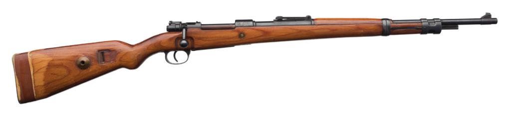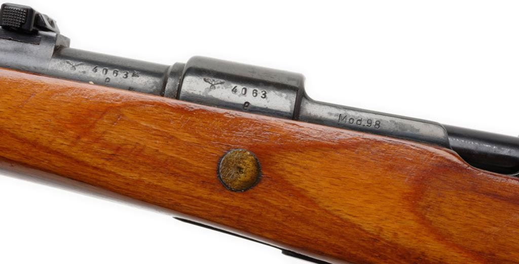 **Mauser Model 98 bolt action rifle, 7.92mm caliber, 24” barrel, #4063, nazi proofed, matching visible numbers, top of receiver is “ar” and “41” marked, blued finish, wood stock with butt stock extended later via use of added wood. This rifle is in overall good condition showing the majority of its military finish to metal surfaces, good bore, action and markings. The stock has been refinished and as noted above, extended. Est.: $250-$500.
