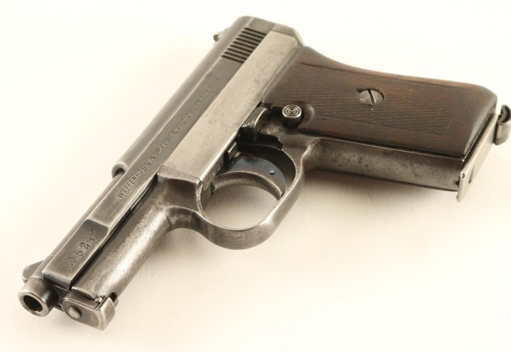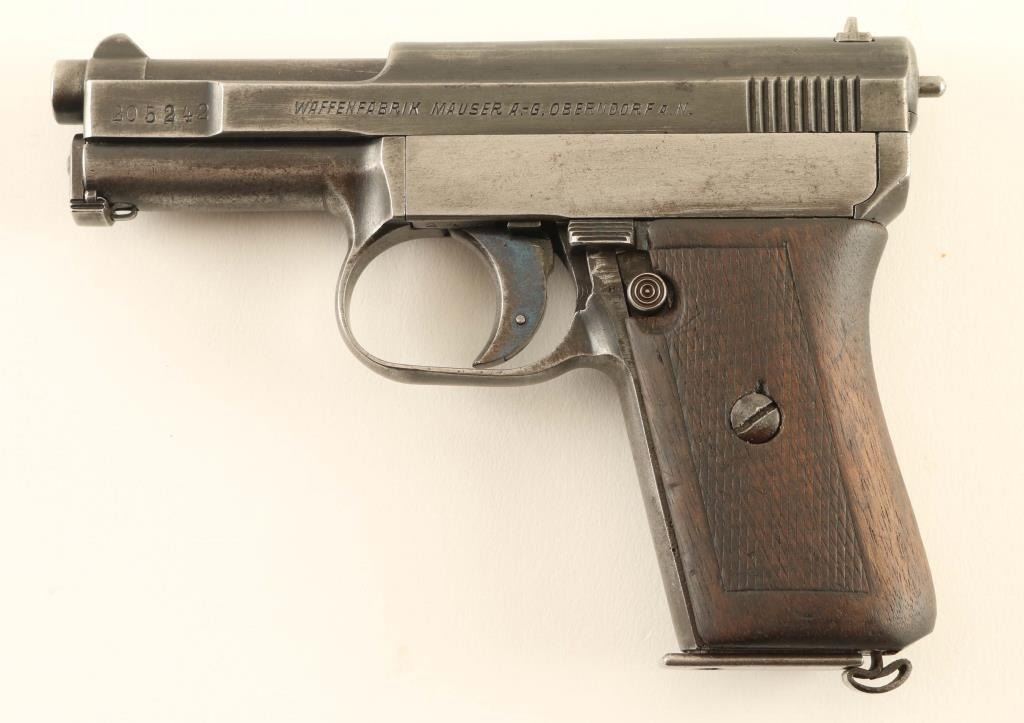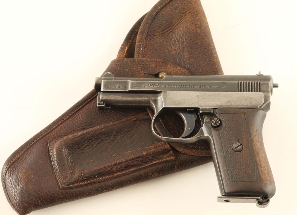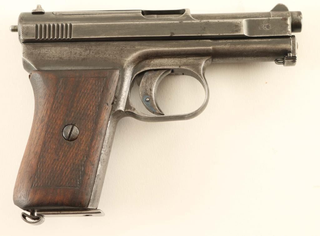 'Interim Production New Model' German made striker-fired semi-automatic pocket pistol chambered in 6.35mm, manufactured circa 1919-1921. The ‘Interim Production’ pistols are comprised of First Variation guns, Second Variation guns and some with mixed attributes.This pistol features a blued finish, 3.15" barrel with fixed blade front sight, dovetailed rear sight with ‘v’ notch, smooth trigger with niter blued finish, thumb safety on the left side of the frame with push button safety release, magazine disconnect safety, heel magazine release, 9 round magazine, steel frame with side latch and one-piece checkered walnut wrap-around grip. Matching serial numbers are found on the frame, slide and barrel. Includes a period brown leather flap holster with belt loop & spare magazine compartment. Pistol retains approximately 20% of its thinned blued finish with the balance of the metal surfaces bearing an aged grey patina with some scattered dark oxidation & pin-prick-pitting. Action is in good working order, the bore is semi-lustrous with good rifling & pin prick pitting and the wood grip is good with wear & a small loss at the top of the backstrap. Condition is near NRA Good. ***C&R Firearm***