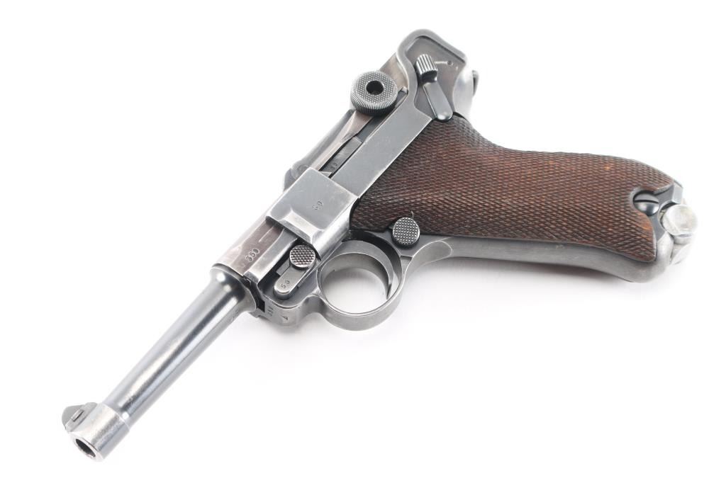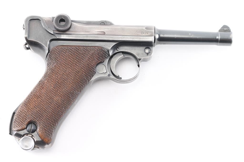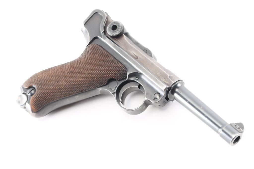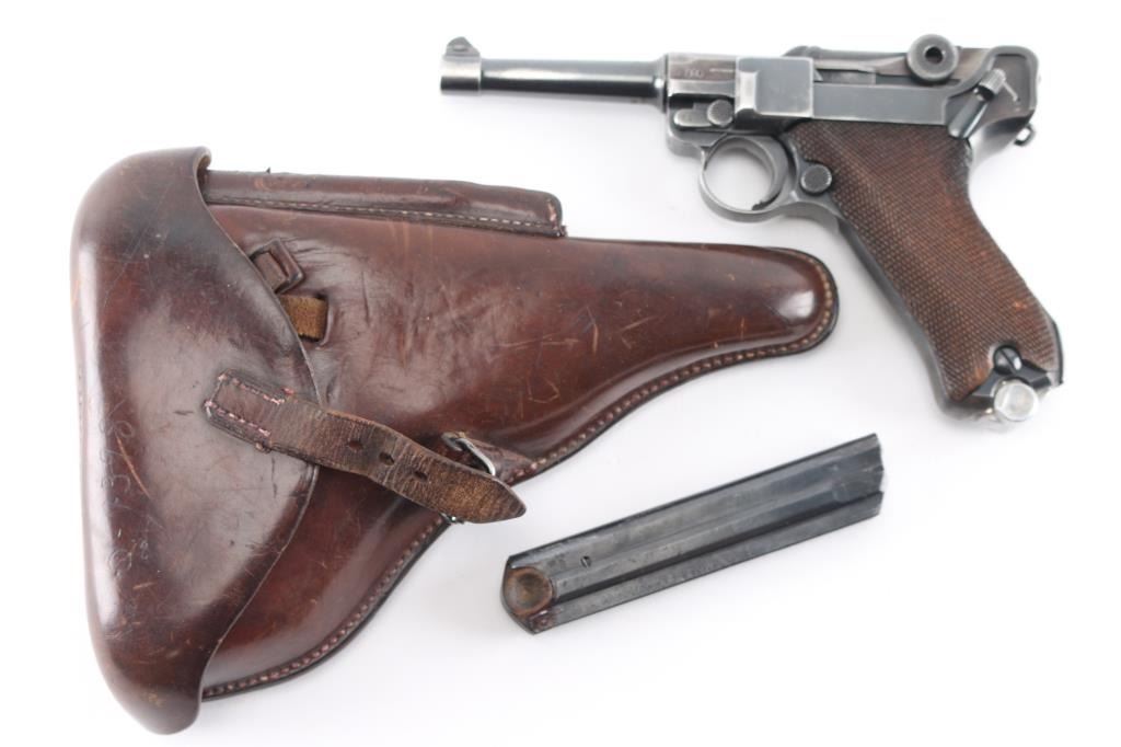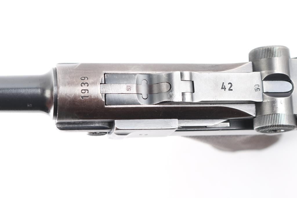 42 Pre-WWII era German military toggle locked recoil operated semi-automatic pistol chambered in 9x19mm Luger, dated 1939. Features blued finish 4" barrel, dovetailed inverted V front sight with witness-marks, v notched rear sight, smooth crescent trigger, knurled charging knobs on the rear toggle link, manual safety of the left side of the frame, knurled push button magazine release, steel frame with lanyard loop & stock lug, and two-piece finely checkered wood grips. All observed serial numbers are matching with the exception of the magazines. Bore is very good condition with slight frosting, a little darkness in grooves. Retains 50% finish with bare metal on edges and high spots, fading brownish color on slide, rub marks on sides of barrel. Trigger and safety are blued. Grips are good or better, slightly loose on frame. Markings include Waffenamt, eagle over 63. Two total magazines, one is bright metal with aluminum plug, unmarked body, plug marked "1158d" & eagle over 154. Second mag is blued, "fxo","P.08", eagle over 37 on body, wood plug has no observed markings, displays roughness. Magazines are overall good or better. Included holster is brown leather, full flap, loading tool in pocket, marked "GEBRUDER KLINGE / DRESDEN / 1939", overall very good, rivet repair to one belt loop on back.Condition is NRA Very Good*** C&R Firearm ***