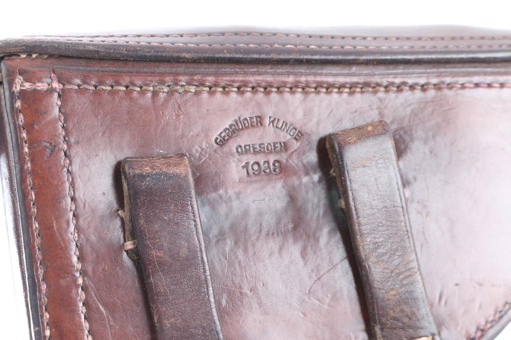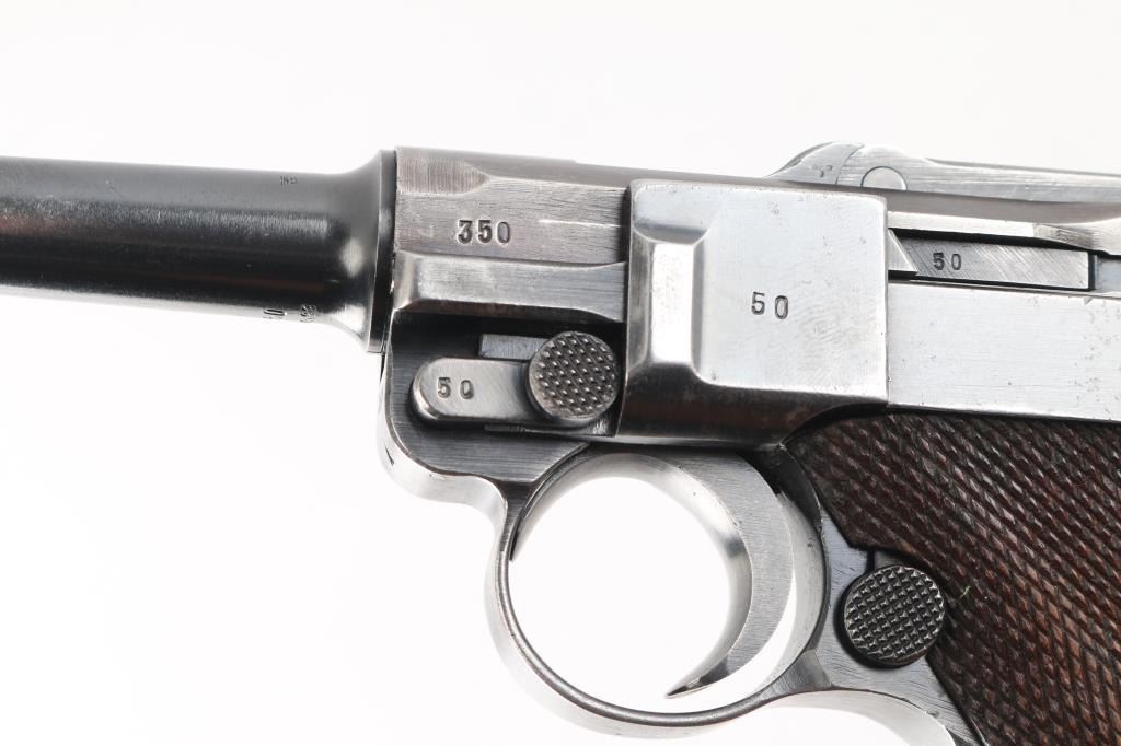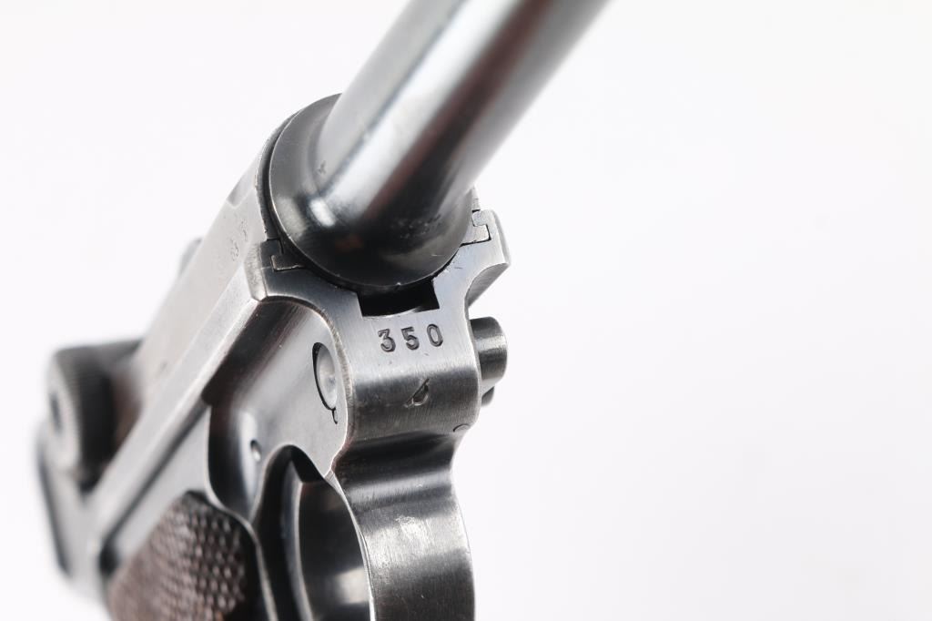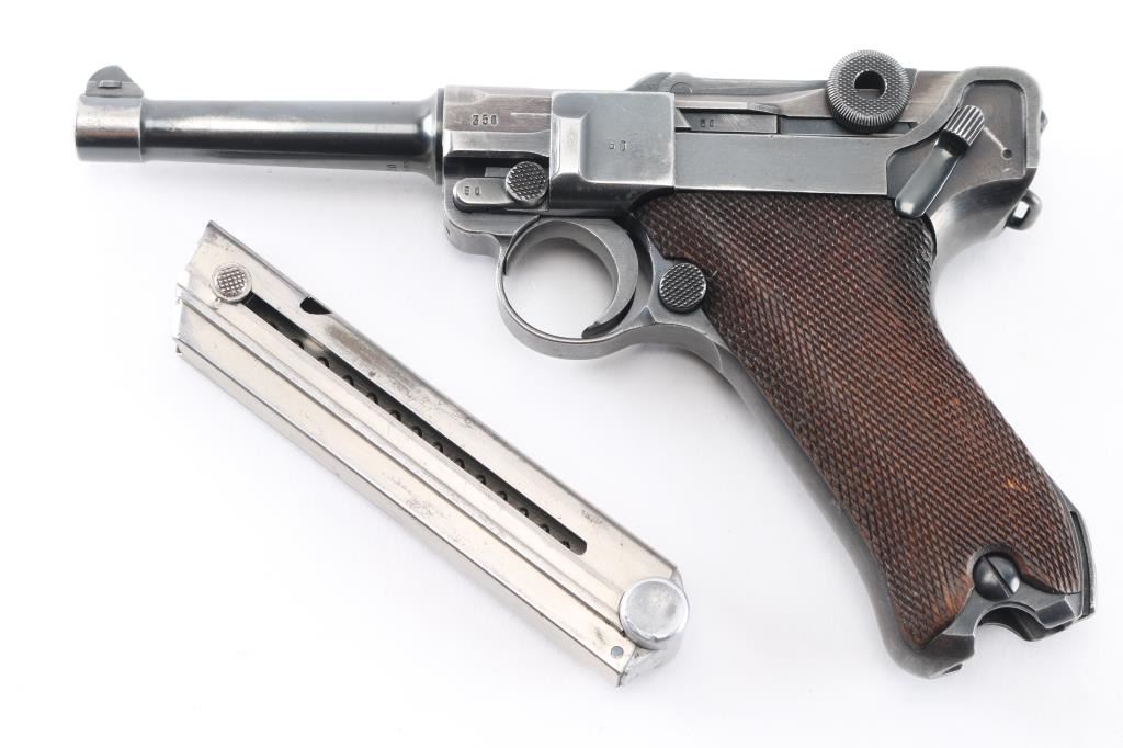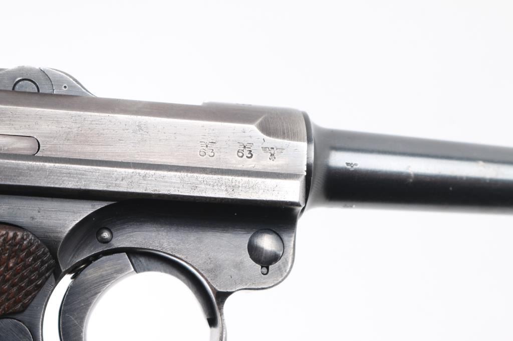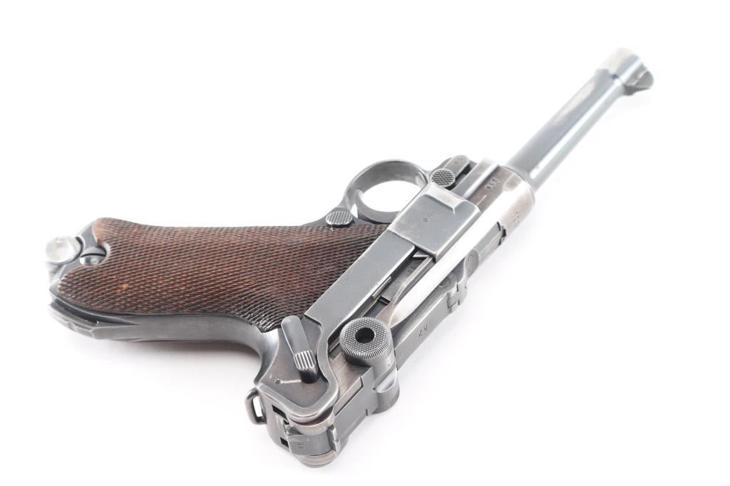 42 Pre-WWII era German military toggle locked recoil operated semi-automatic pistol chambered in 9x19mm Luger, dated 1939. Features blued finish 4" barrel, dovetailed inverted V front sight with witness-marks, v notched rear sight, smooth crescent trigger, knurled charging knobs on the rear toggle link, manual safety of the left side of the frame, knurled push button magazine release, steel frame with lanyard loop & stock lug, and two-piece finely checkered wood grips. All observed serial numbers are matching with the exception of the magazines. Bore is very good condition with slight frosting, a little darkness in grooves. Retains 50% finish with bare metal on edges and high spots, fading brownish color on slide, rub marks on sides of barrel. Trigger and safety are blued. Grips are good or better, slightly loose on frame. Markings include Waffenamt, eagle over 63. Two total magazines, one is bright metal with aluminum plug, unmarked body, plug marked "1158d" & eagle over 154. Second mag is blued, "fxo","P.08", eagle over 37 on body, wood plug has no observed markings, displays roughness. Magazines are overall good or better. Included holster is brown leather, full flap, loading tool in pocket, marked "GEBRUDER KLINGE / DRESDEN / 1939", overall very good, rivet repair to one belt loop on back.Condition is NRA Very Good*** C&R Firearm ***