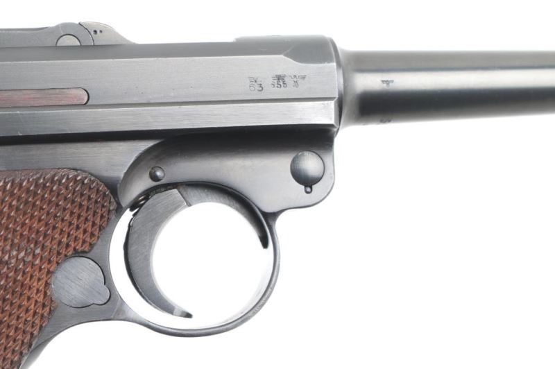Pistol. Semi-Automatic. 8 rd Magazine. Matched Magazine. Toggle-locked, short recoil. German WW2 Military issued sidearm.3.9" barrel. Mauser "42" code on toggle. 1939 dated. Serial numbers matched on all parts,Nazi proofs wit Eagle/63, and Eagle/655 (Mauser) waffenamts. Small "8,82" stamped under the serial number on the underside on the barrel. Bore appears excellent/bright. Checkered wood grips are very good. Blued finish is about 98% with some minor scratches. All markings are crisp/clear. Magazine is matched to the pistol stamped "5529 w" with Eagle 63 Waffenamt. NRA Condition-Very Good. C&R Firearm.