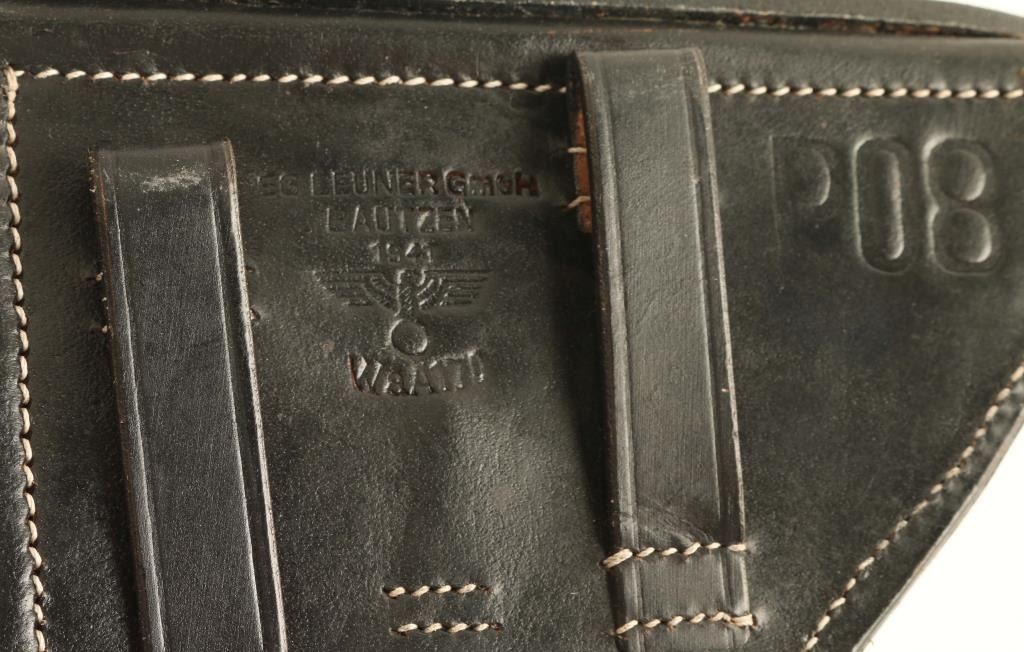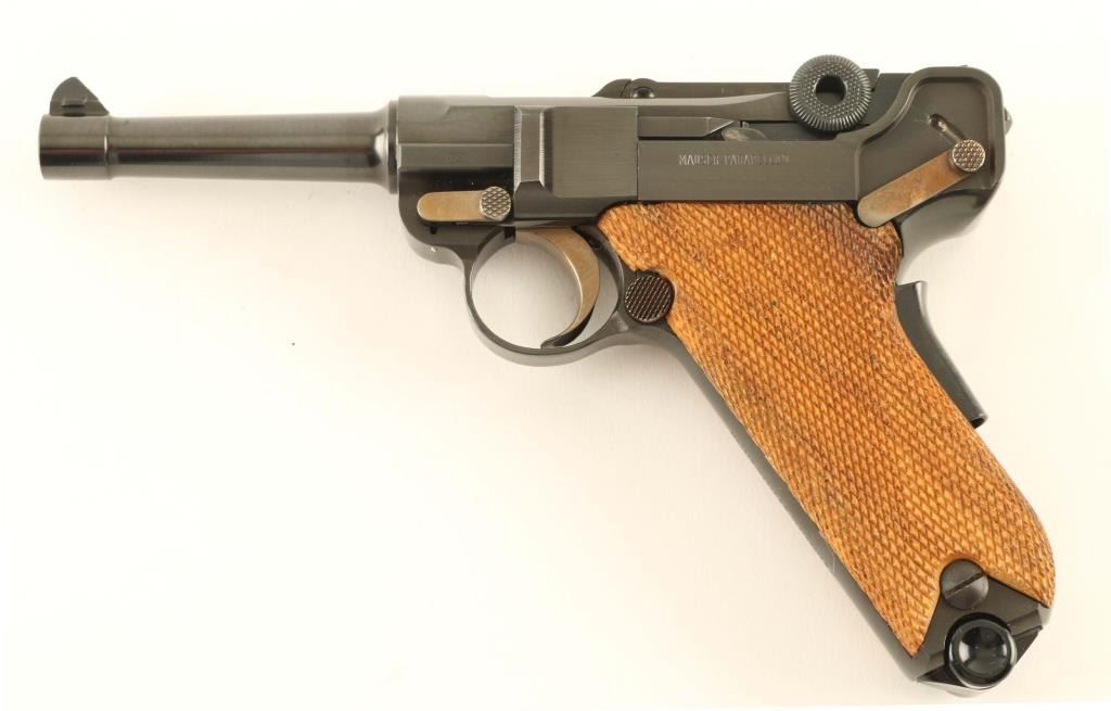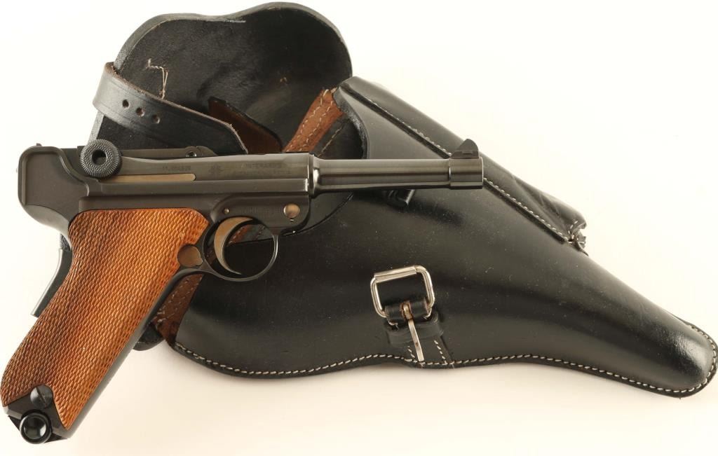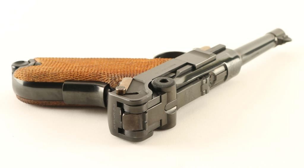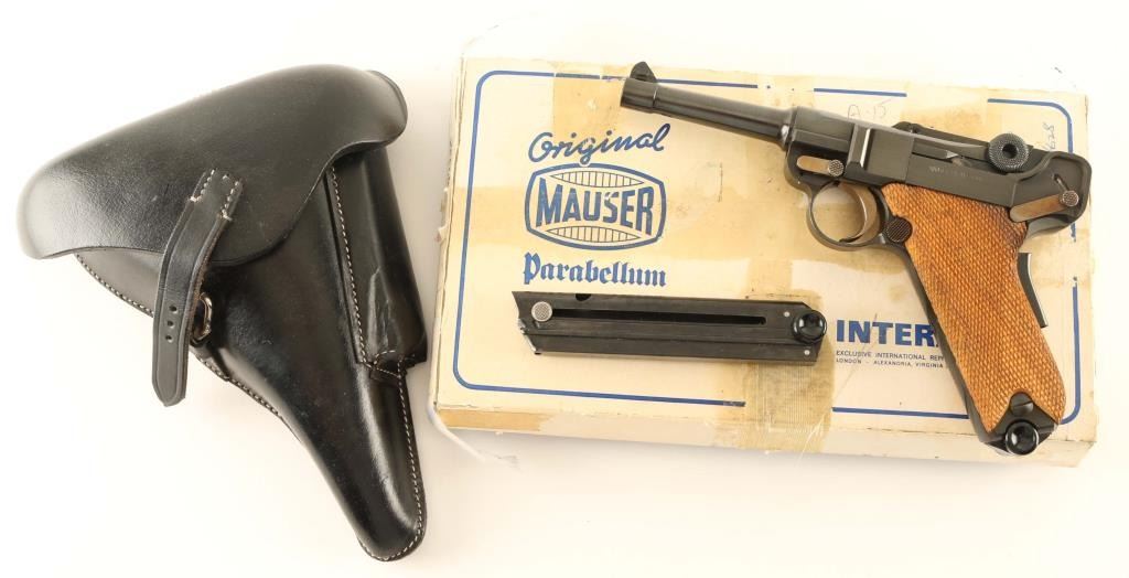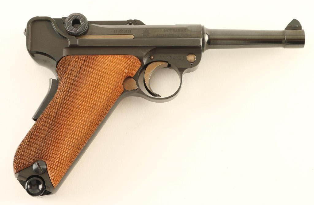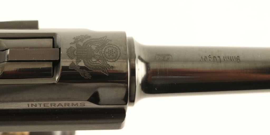 ‘American Eagle Luger’ Post-war commercial production toggle lock recoil operated semi-automatic pistol chambered in 9mm Luger, manufactured in Germany circa 1970’s. Imported by Interarms of Alexandria, Virginia with import stamp on the right side of the barrel extension. Features a blued finish with straw colored small parts & American Eagle crest to top of the breech, 4" barrel, dovetailed inverted 'v' serrated ramp front sight, 'u' notched rear sight, smooth crescent trigger, knurled charging knobs on the rear toggle link, manual safety of the left side of the frame, grip safety, knurled push button magazine release, 8 round magazine with black plastic base, steel frame, and two-piece checkered wood grips. Includes the original factory two-piece cardboard box with spare magazine and loading tool. Also includes a reproduction WWII black leather holster. Pistol retains approximately 99% of its original blued finish showing light wear on the back of the frame from the rear toggle link with little wear observed elsewhere. Action is sound, the bore is pristine, and the wood grips are fine. Condition is near NRA Perfect. ***Modern Firearm***