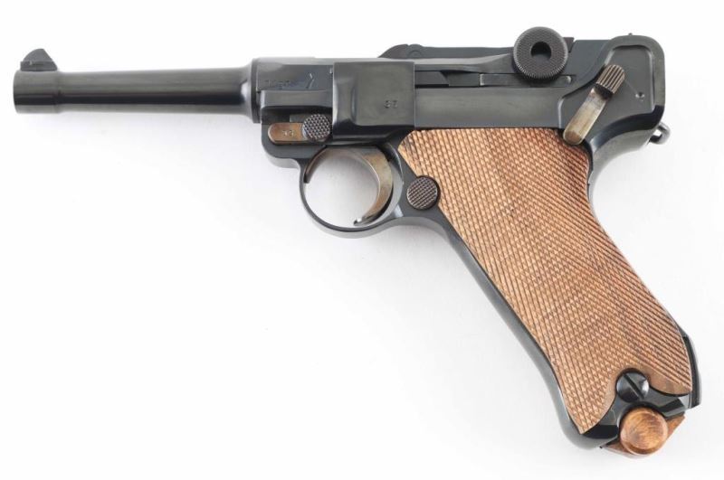 German semiautomatic pistol appears rebuilt. Features glossy dark reblued finish, checkered wood grips, 4" barrel, fixed sights, manual safety, push button magazine release, lanyard bar, stock bolt on heel. Bore is very good condition. Retains 98% finish, including dark bold straw colors on some small parts. Wood grips appear new. Many markings, including two digit numbers on various parts and S/42 on toggle are located in a dished area with new numbers showing even depth. Hints of previous numbers visible under magnification. Observed numbers on internal parts show mismatch. Faint "2435" hand lettered on rear toggle. No markings on bottom of barrel. Large "X" stamped on receiver behind serial number, both these marks partially eroded. No importer marks observed. Includes one aftermarket magazine with wood base. Condition is NRA Excellent (reworked) *** C&R Firearm ***