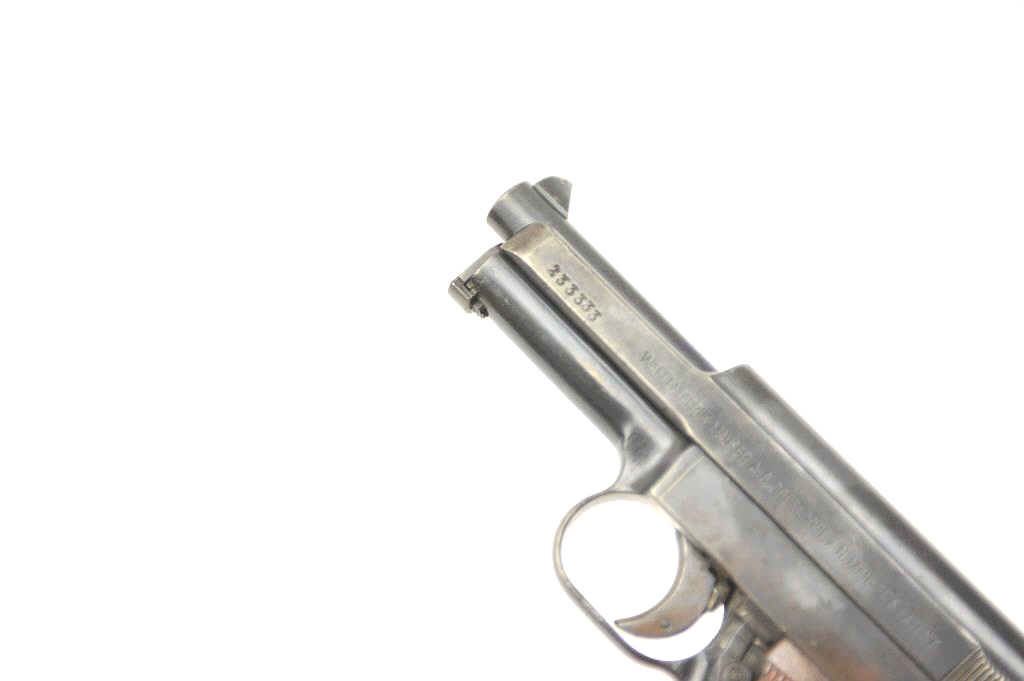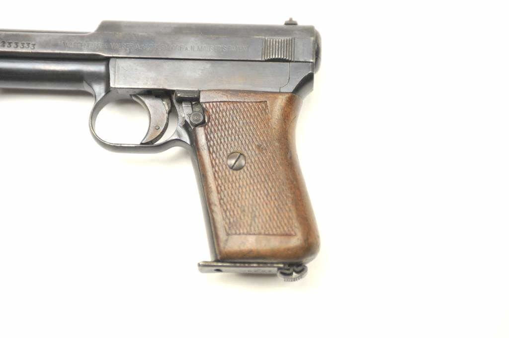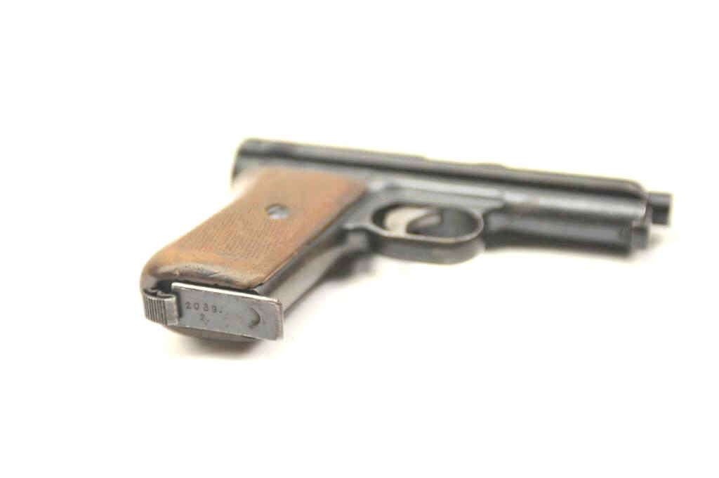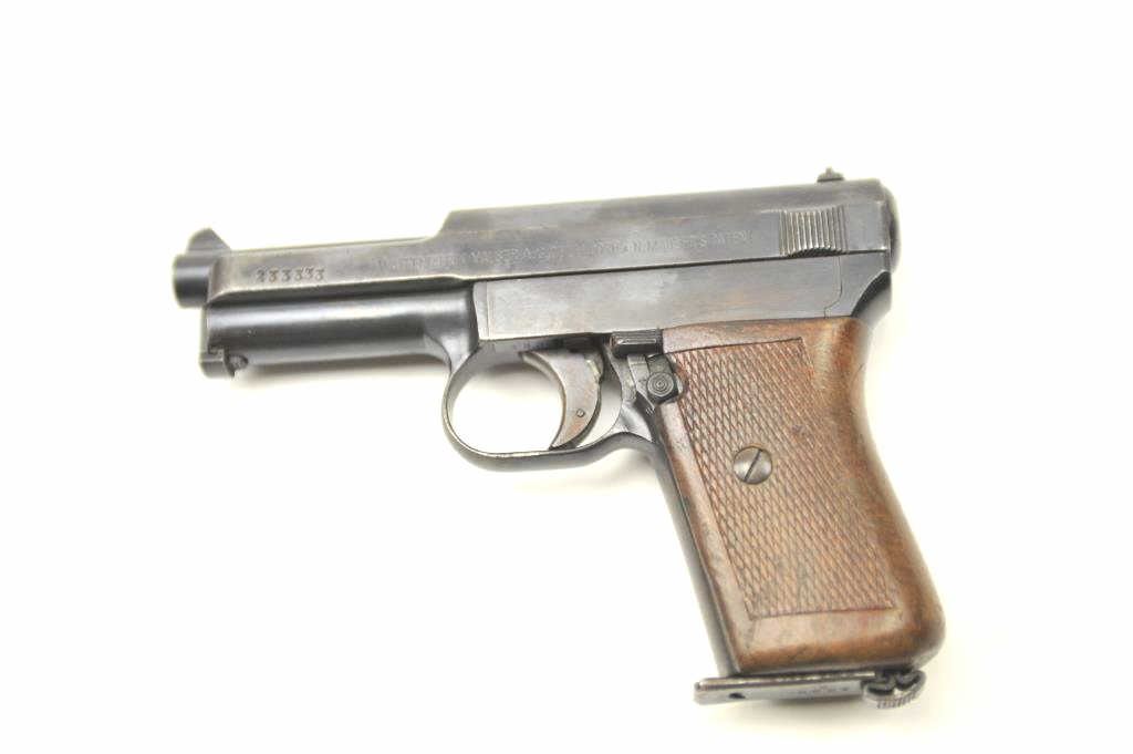 Mauser Semi-Auto Pocket Pistol in .32 caliber, S/N 233333 remaining in good to very good original condition showing 75%-85% original toning blue. Good markings and very good grips. Magazine is numbered 2039-2 (Notmatching). Bright bore and would clean nicely. German officer’s favorite during both wars. (C&R/PPT) Est.: $300-$600