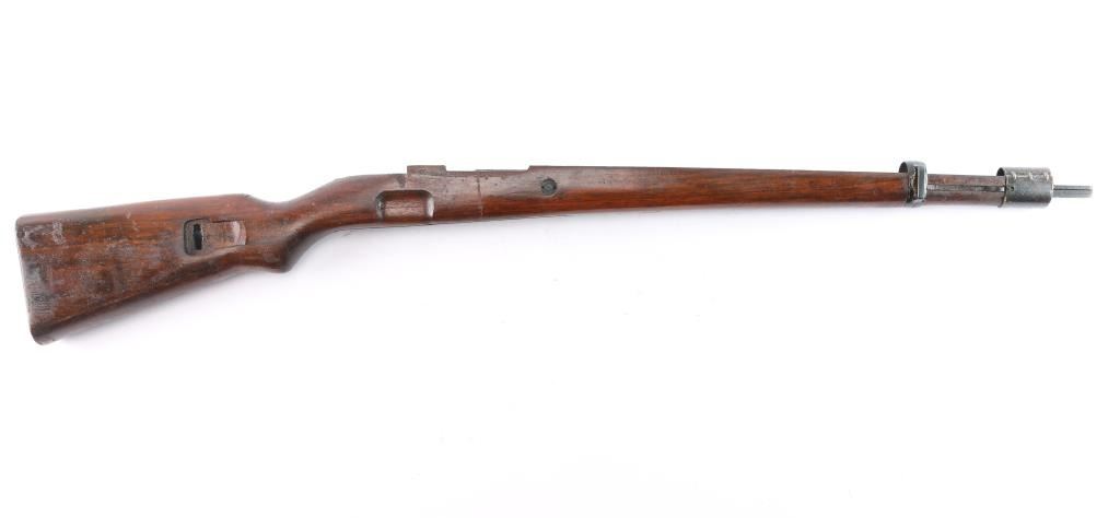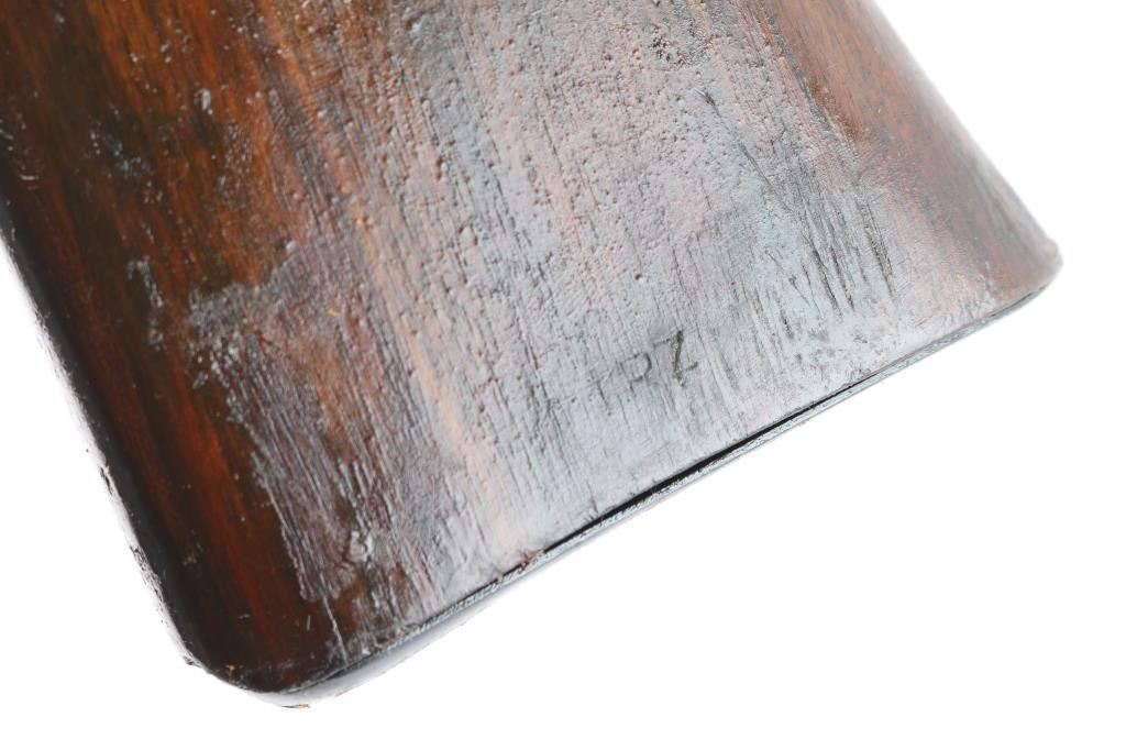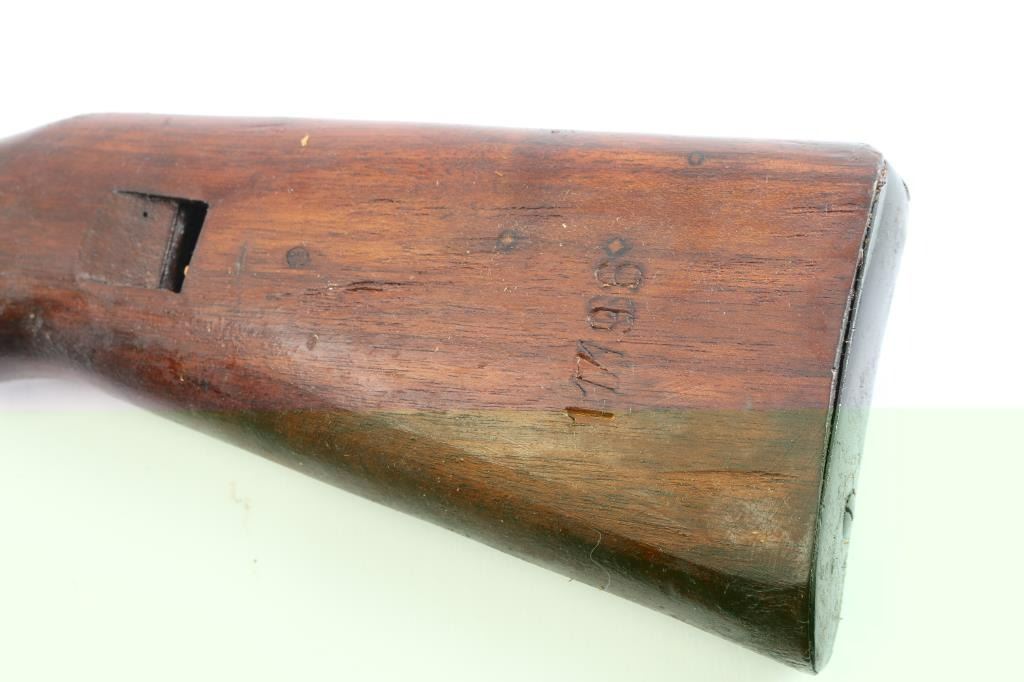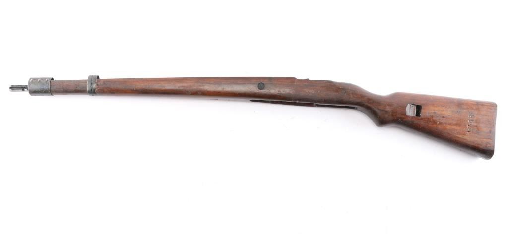 Very clean Mauser wood stock set. Stock is numbered '1796' on the left side of the buttstock, and '1.TRZ' on the right side. It has a sling loop in the front, a bayonet lug, a smooth flat buttplate, matching handguard, and a sling slot cut in the rear. The handguard appears to be marked '719' on the inside. The wood is in excellent condition with extremely light handling marks. The end cap, buttplate, bayonet lug, and sling loop, retain 95% of their blueing. There is a small amount of edge wear, and handling marks on the end cap. Late war style.