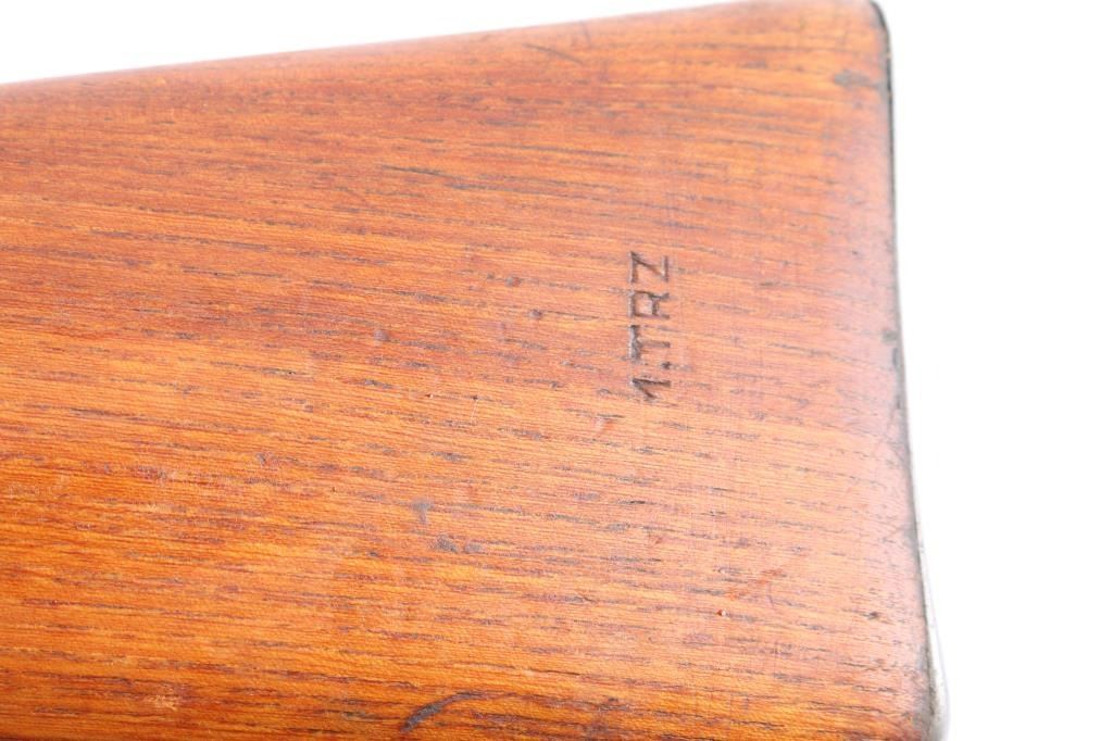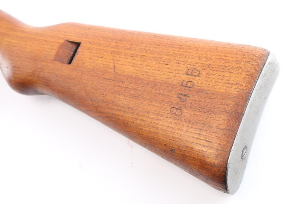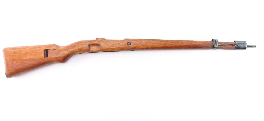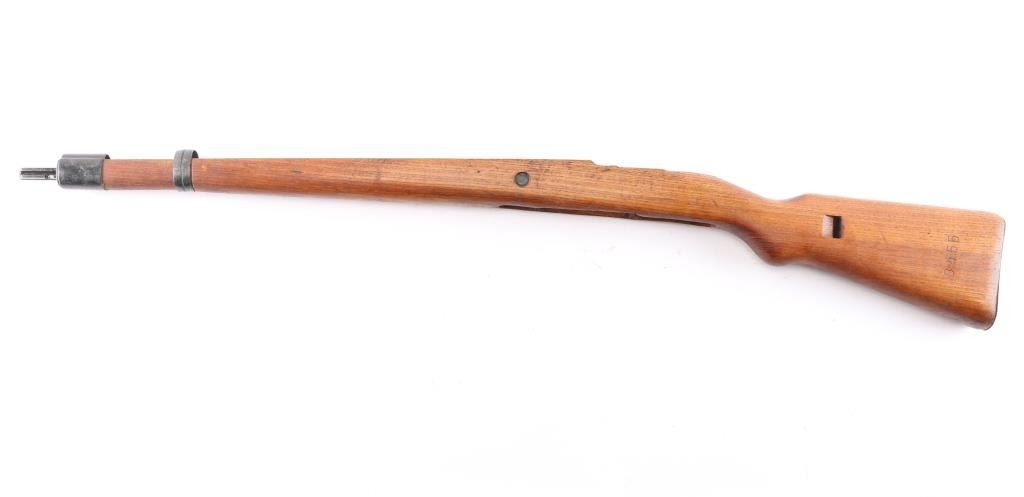 Very clean Mauser wood stock set. Stock is numbered '3627' on the left side of the buttstock, and '1.TRZ' on the right side. It has two sling swivels on the barrel band, a bayonet lug, a 'H' style end cap, flat buttplate, early style handguard (no cosmoline), a sling swivel by the pistol grip, and a sling swivel on the buttstock. The handguard is not marked on the inside. The wood is in excellent condition with extremely light handling marks, but is covered with hardened cosmoline, and packaging paper. The end cap, bayonet lug, and sling loop, retain 95% of their blueing. The buttplate is not blued. Early war style, and a cleaning rod is included in the stock.