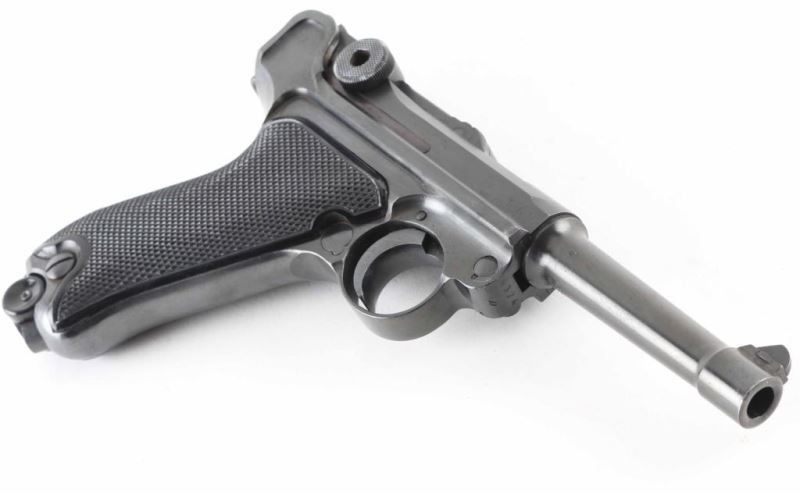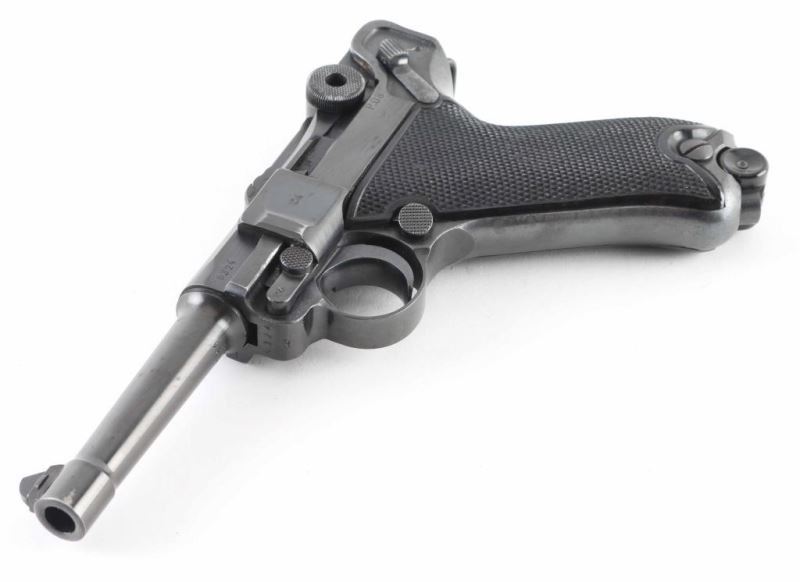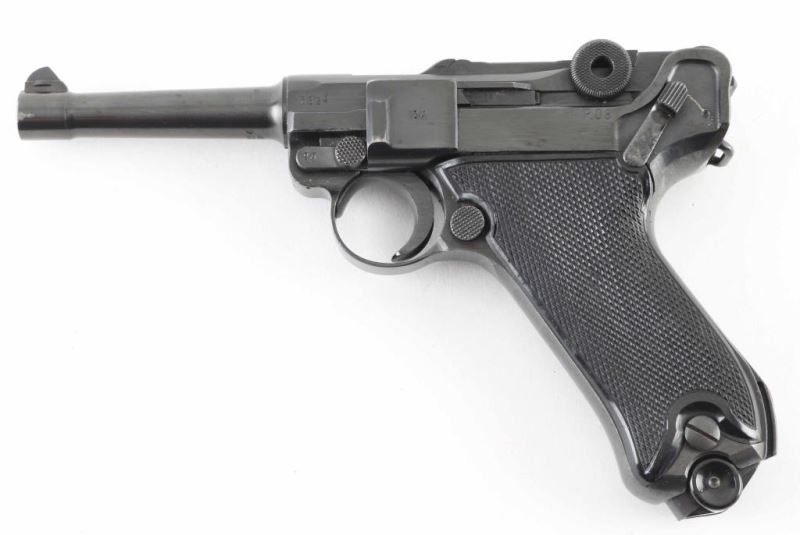 German semiautomatic pistol features blued finish, checkered black plastic grips, 4" barrel, fixed sights, manual safety, push button magazine release, lanyard bar, stock bolt on heel. Bore is very good condition. Retains 80% coverage of dark strong bluing, bare metal on some edges & where handled, large areas of blotchy finish loss on grip straps & safety lever with light patina. Grips are very good condition. Observed numbers match. Markings are crisp and readable, include eagle over "655", Waffenamts. No importer marks observed. Includes one good condition magazine with black plastic base plug, marked "P08", "fxo", eagle over "37". Included magazine does not lock the action open - tested with a different mag and action locks open. Condition is NRA Very Good *** C&R Firearm ***