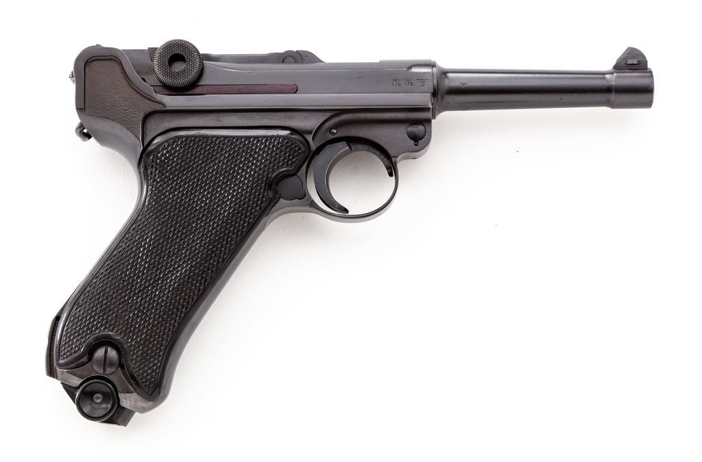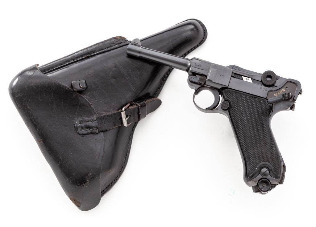 Mauser byf-42 date Black Widow Luger Rig, #9846, 9mm, 4'' barrel, blue finish, molded checkered black plastic grips, with two (2) blue-bodied ''fxo'' marked magazines with unnumbered black pinned bases. Chamber marked ''42'', central toggle link marked ''byf'', Geischert/Geladen safety and extractor. In black leather holster coded ''dkk/42'', with correct ''WaA 135'' proofed tool. All visible matching numbers. Condition is near excellent showing approx. 97% of a restored blue finish. Grips with moderate flattening and small loss to top of left panel. Good action, fine bore. Holster is excellent, with white stitching to backside and evidence of polishing to front portion, with one internal small glued repair. Est.: $1,800-$2,400. (C&R)