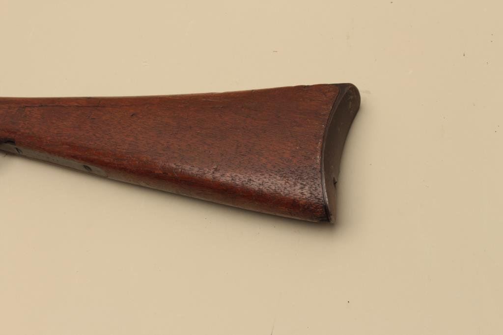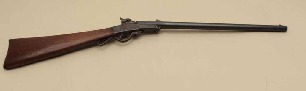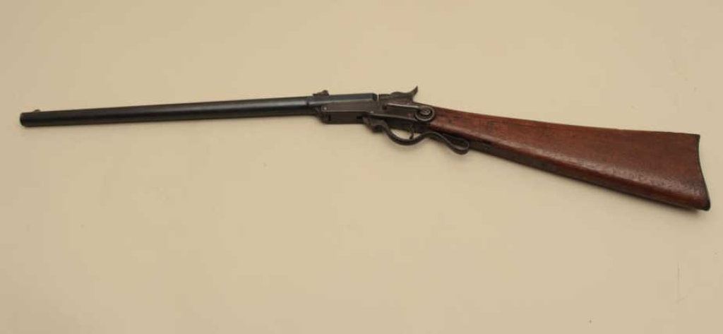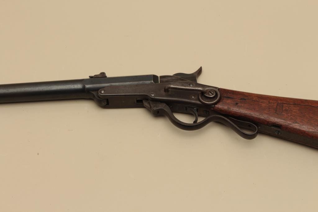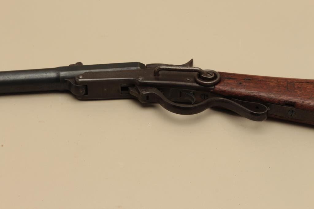 and case hardened finish, wood stock, S/N 19438, in overall good condition with majority of original blue remaining on barrel, silver tone on receiver with hints of original case colors, good bore, crisp action, good markings and fair to good butt stock showing weathering, wear, some old cracks near wrist and an old loss behind the upper tang. (Antique). Est.: $700-$1,400.
