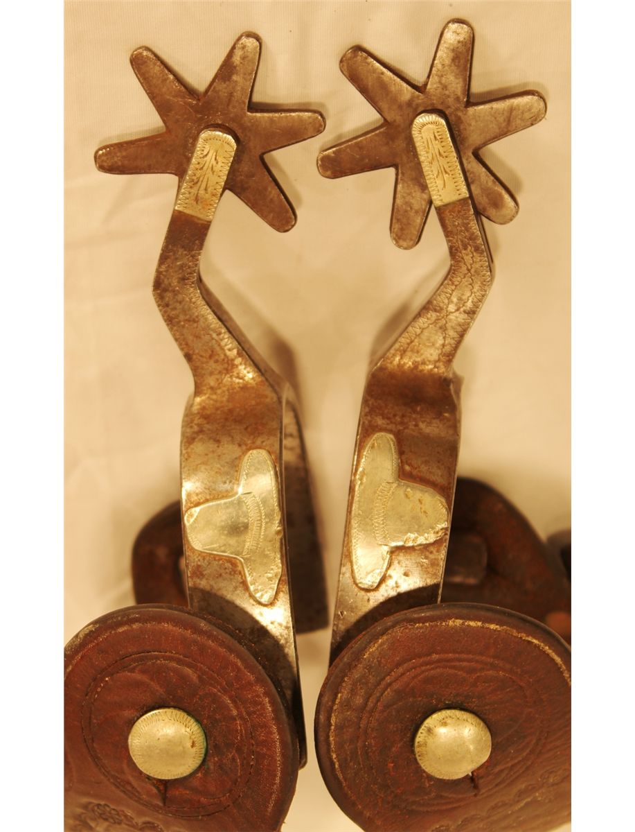 McChesney Hat Spurs; a nice large pair a single mounted hats, exceptionally clean and nice condition, with 2 1/2" rowels and original straps.
