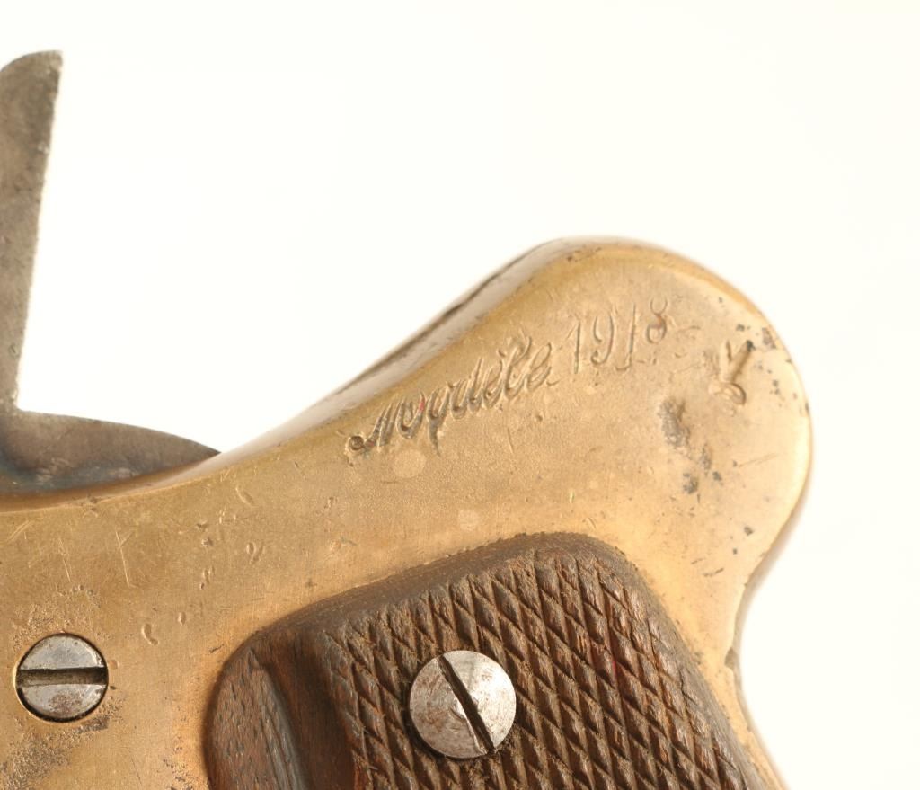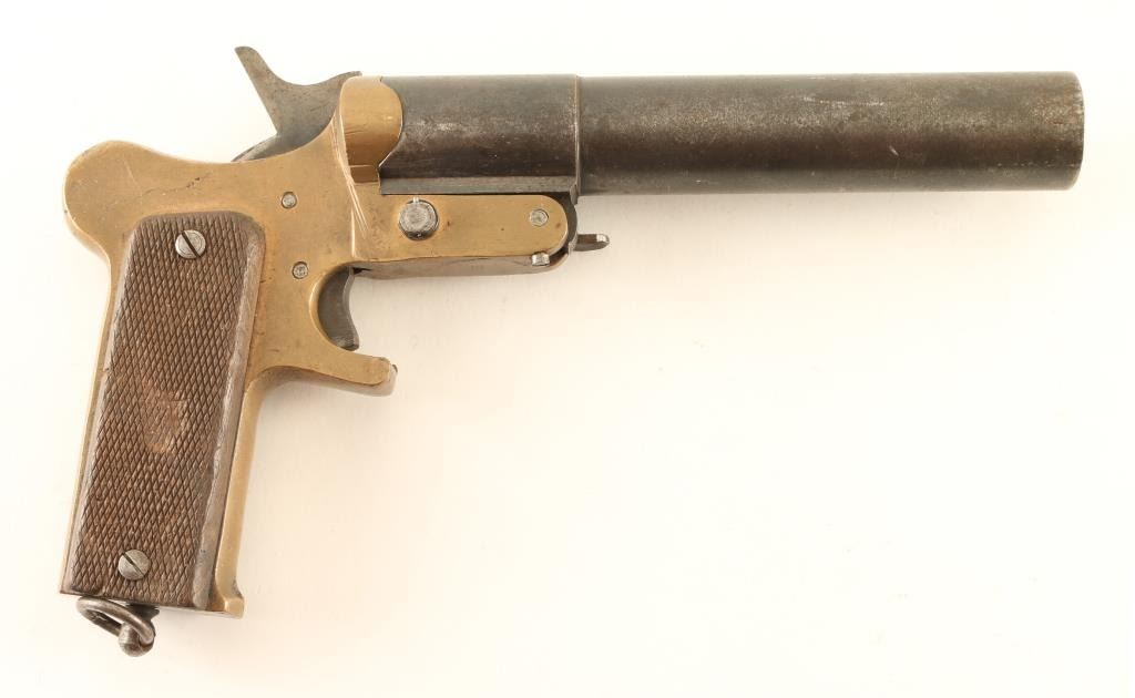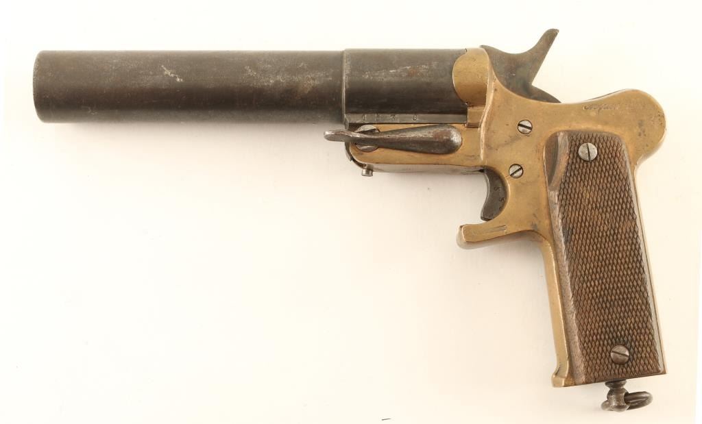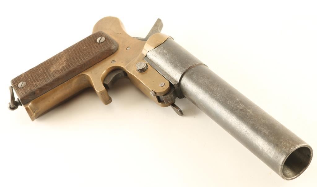 #1538 French WWI flare launching signal pistol features approx 7" barrel, side latch, single action trigger, lanyard ring at butt. Bore is good condition with minimal roughness. Barrel retains 75% even grayish color bluing with thinning and some bare metal. Brass frame is good condition with casting marks evident. Good condition wood grips are checkered, show signs of heavy use. Marked "Mecanicarm", "Modele 1918", matching numbers on barrel and frame. Overall condition is Very Good.