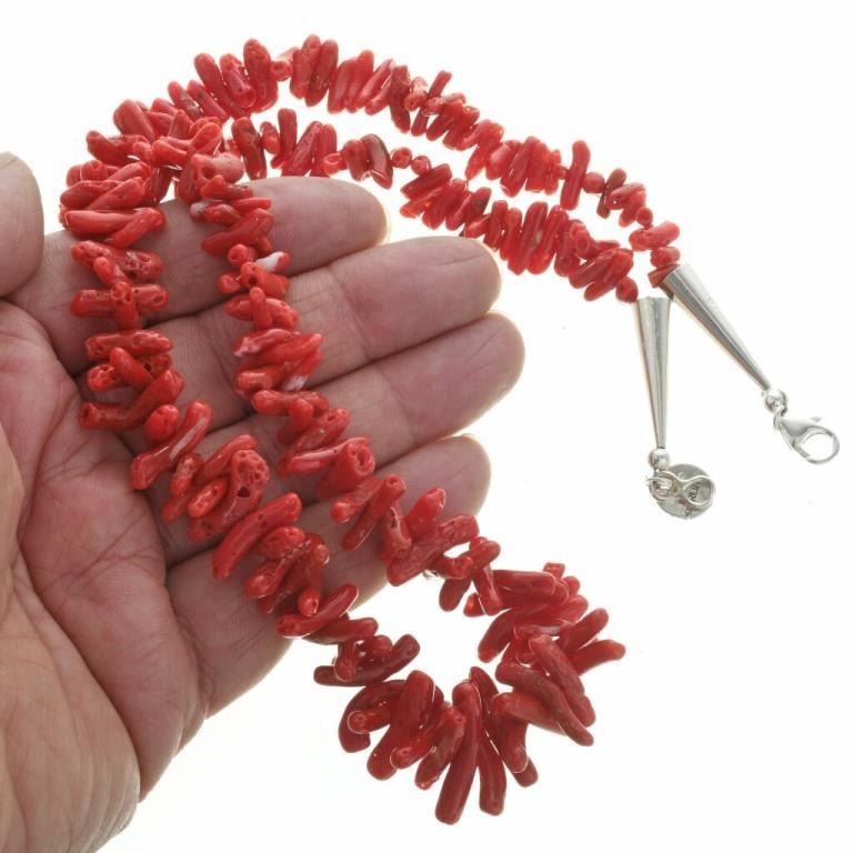 Grade AA Branch. This Mediterranean Coral Navajo Necklace displays the gorgeous, natural color of Grade AA branch pieces. This lively strand, features pieces that were drilled and polished in our shop in graduated sizes, 6mm at the ends to about 20mm at the center. The edges are softened for a comfortable wearing experience. About 24" long, including the Sterling cones and lobster claw clasp. Designed and strung by Lula Begay.