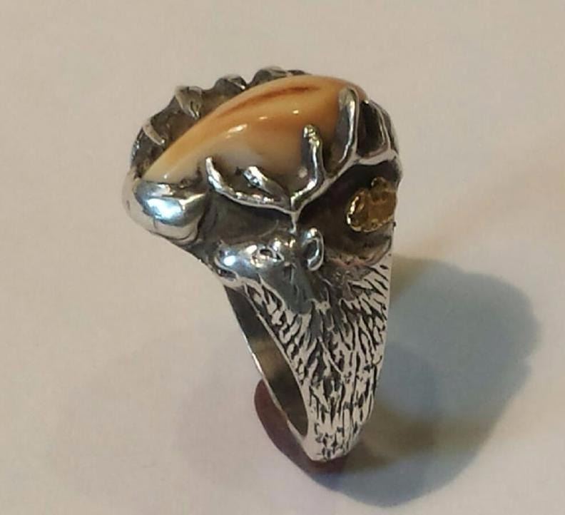 Men’s elk ivory ring. Each item made at Jewel Crafters in Yakima, WA is unique and custom made. The actual ring being sold may look slightly different from the picture since each piece is made by hand around a specific elk ivory. The basic design is similar, with a genuine Alaskan gold nugget inlaid on each side under the antlers, and a sculpted design that wraps completely around the bottom of the band.