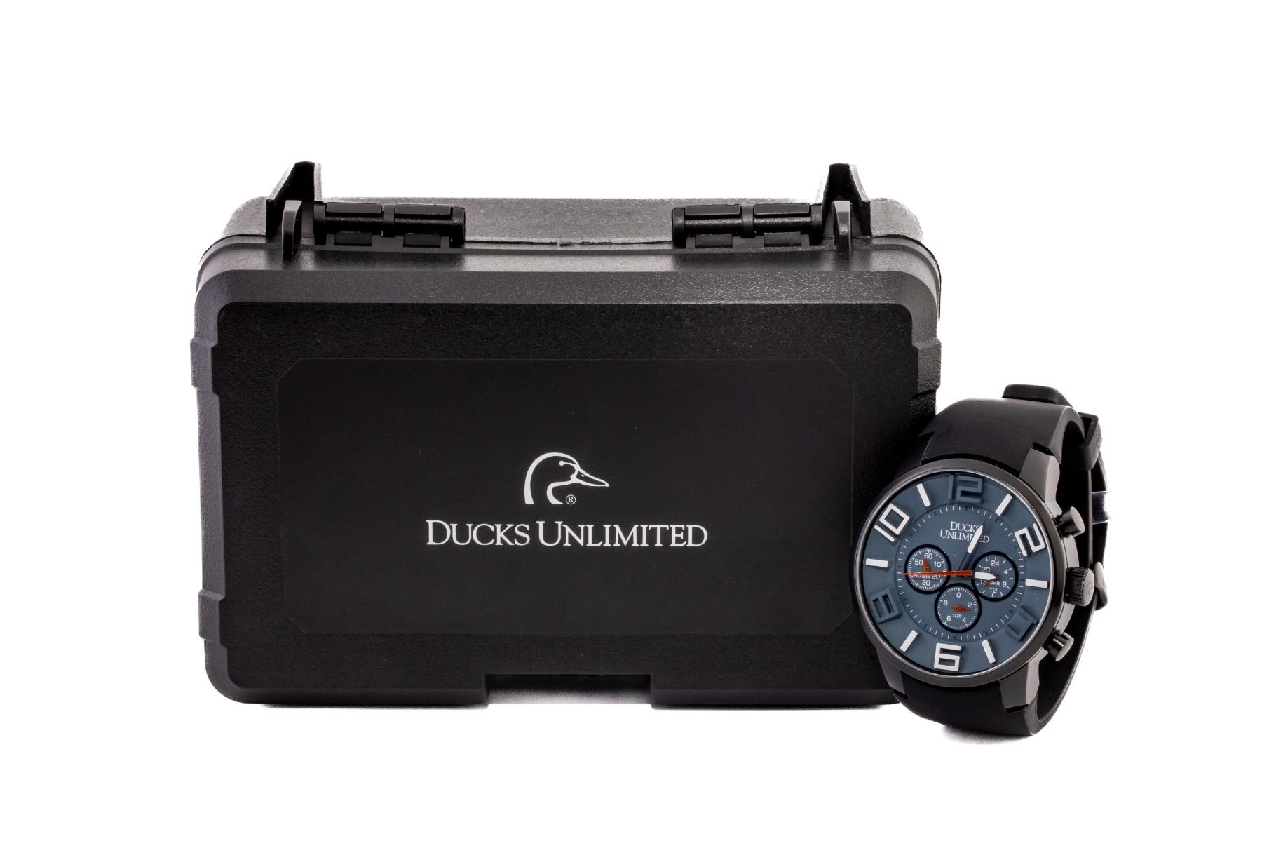 Men’s Harlequin Field Watch is designed for the outdoors, it is constructed for rugged field use. The watch is a black stainless-steel case and a black silicone band. Seiko VD31 movement, scratch resistant sapphire glass. Water resistant up to 20atm. Ducks Unlimited printed on the dial. One-year parts and replacement warranty.