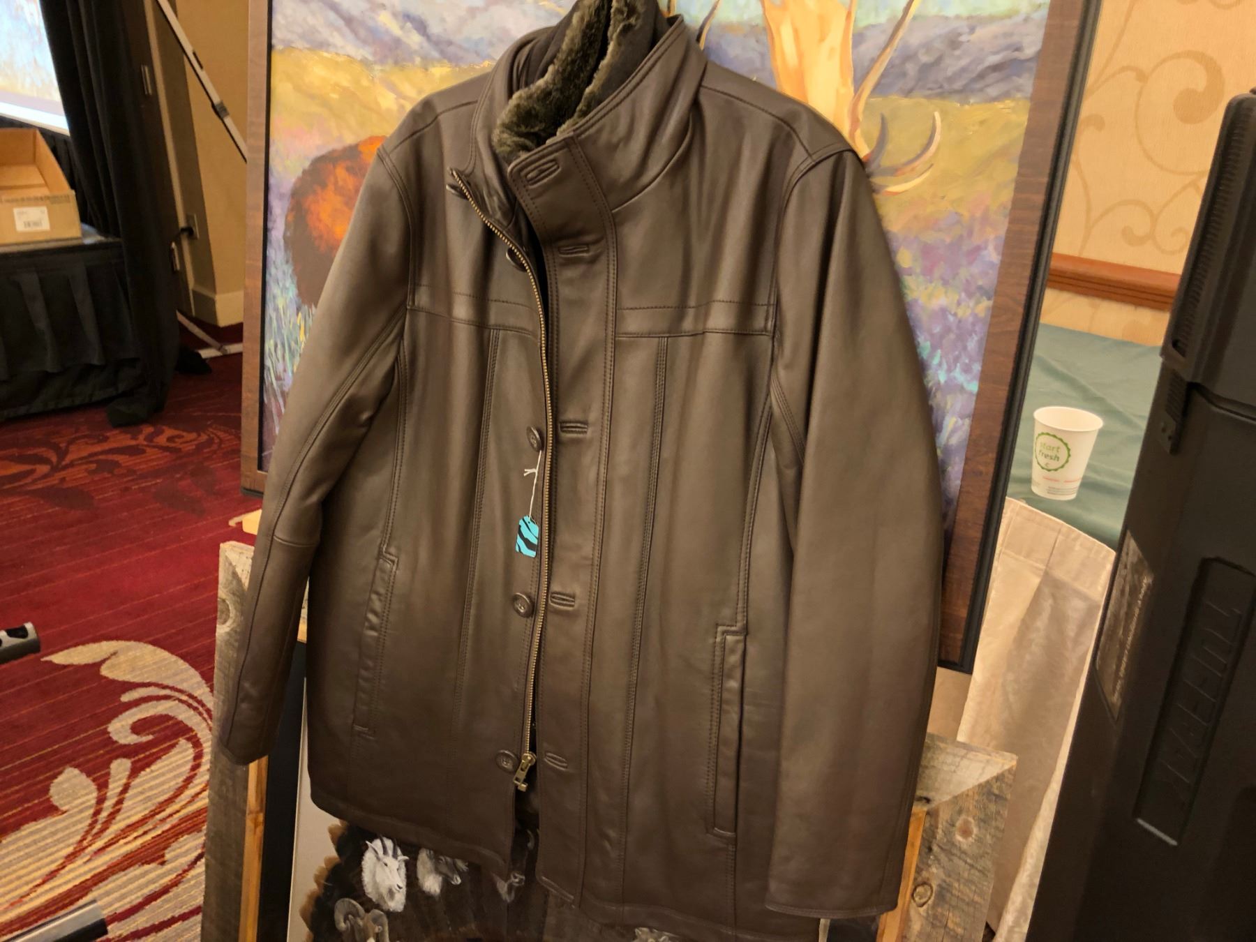 This beautiful men's coat is lambskin leather in 3/4 length with a zipper and button front and detachable inside wool at neck. It is available in sizes L to 4XL.