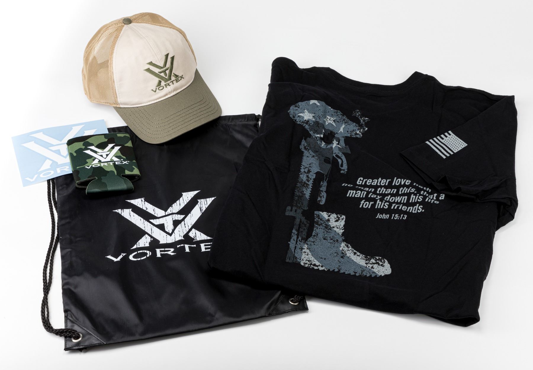Vortex men's Lg black tee, cap, koozie, drawstring bag and sticker