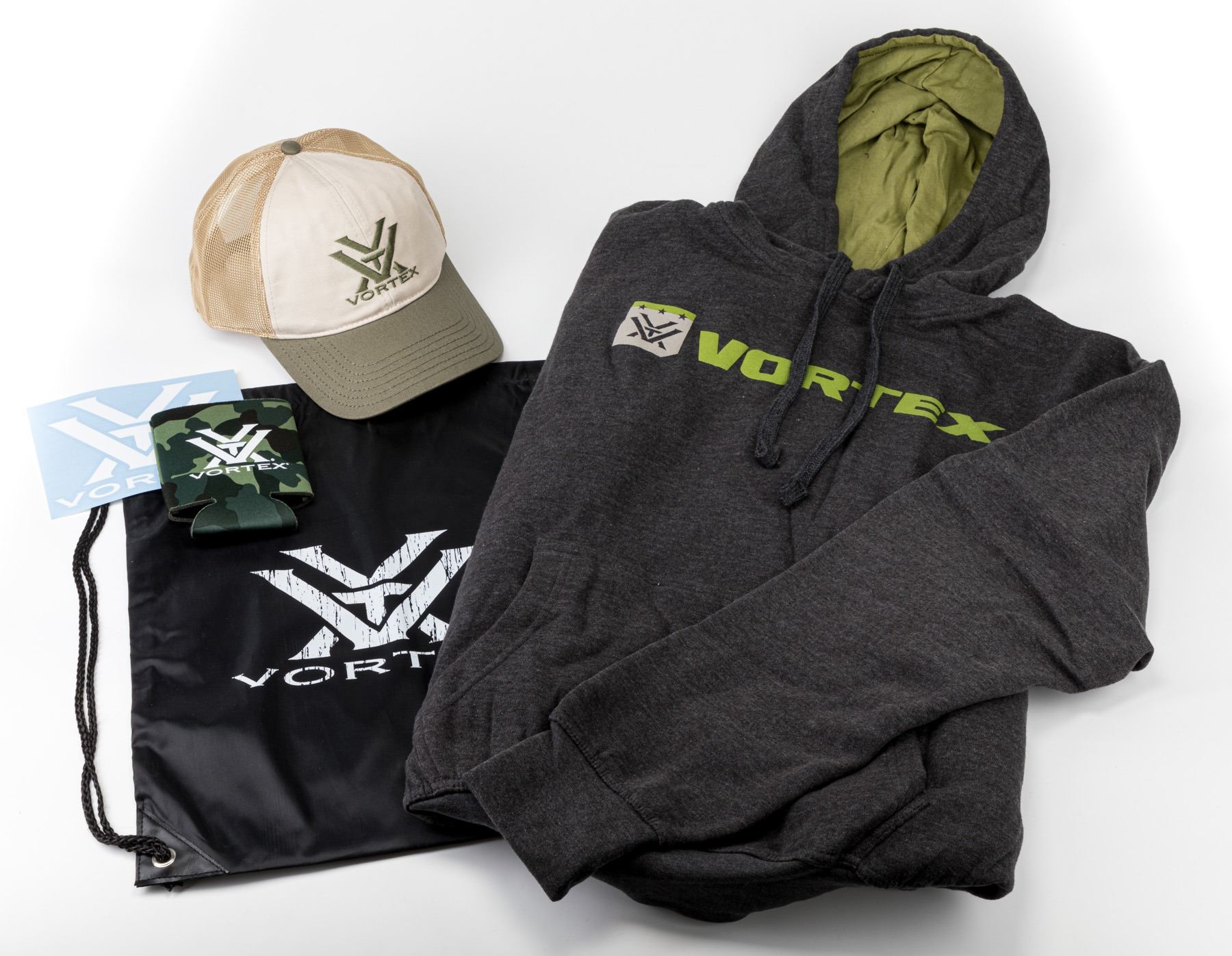 Vortex mens medium hoodie tee, cap, koozie, drawstring bag and sticker