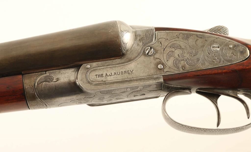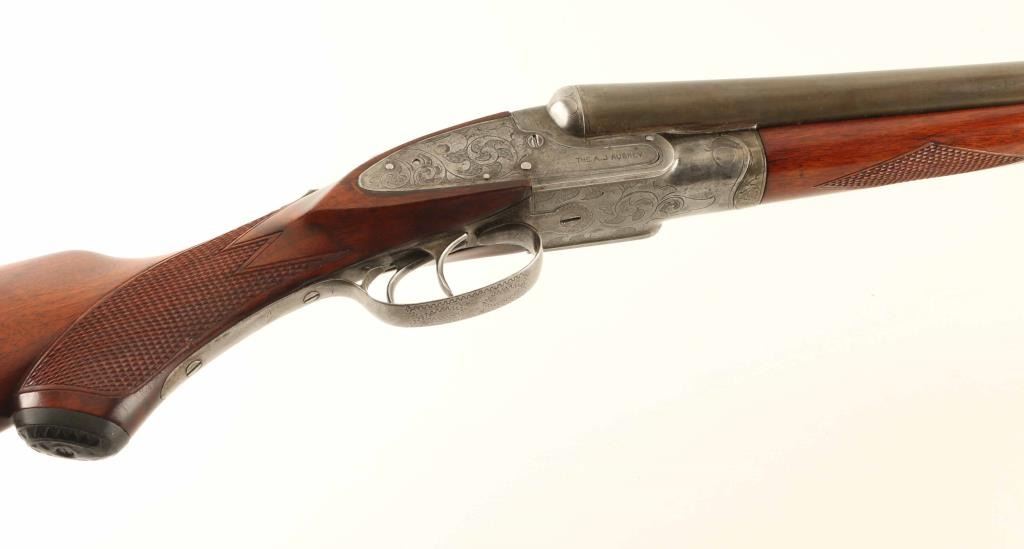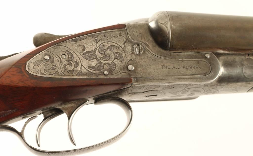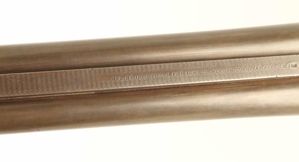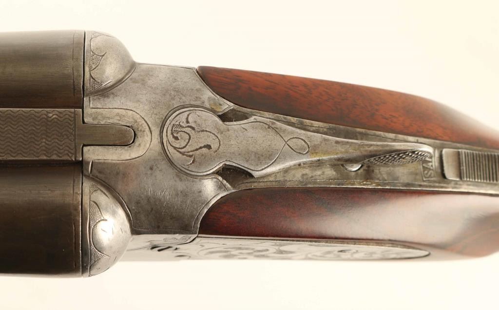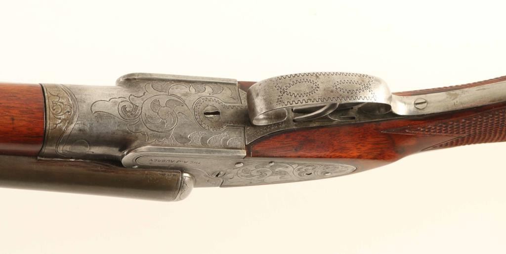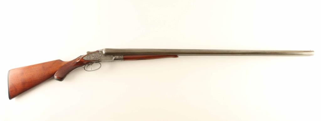Side by Side shotgun manufactured circa 1905-1910. Features gray color finish on 32" barrels, bare metal action, checkered wood splinter forend, wood butt with checkered wrist & open curved grip, gutta percha grip cap & buttplate, brass front bead, double triggers, tang safety, extractor plate. Bores are good, both fixed FULL chokes. Barrels retain 85% coverage of mostly smooth even brownish gray, with some scrapes and scratches, small sharp dent on bottom of right barrel. Metal surfaces on action are very good condition, smooth, with 70% coverage of scroll engraving. Wood is very good condition, appears repaired with re-cut checkering. Approx stock measurements: 13-3/4" Length of Pull, 1-3/4" Drop at Comb, 3-1/4" Drop at Heel. Condition is NRA Very Good *** C&R Firearm ***