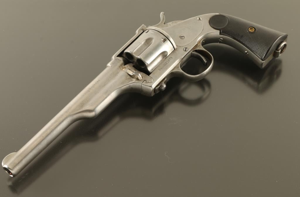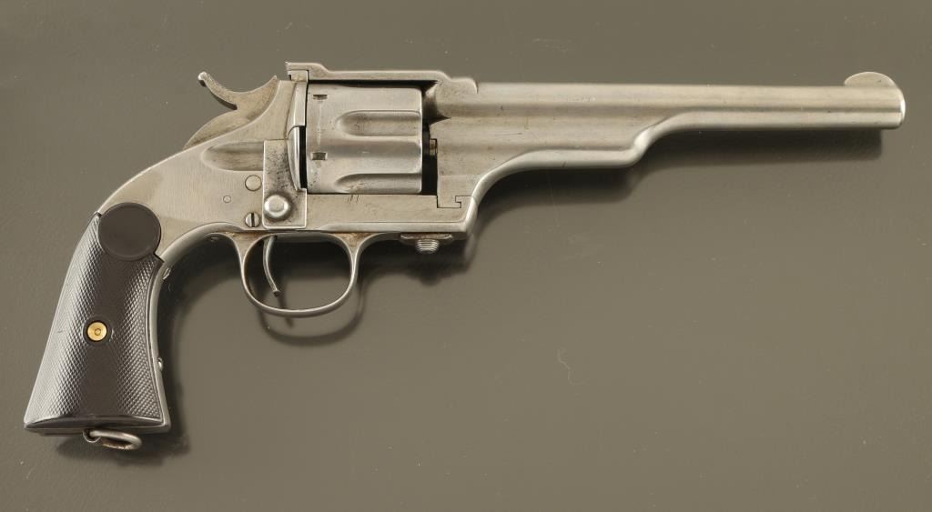 SN: 25198 Single action revolver manufactured by Hopkins & Allen in Norwich, CT circa 1876-1880's. Features bare metal finish, checkered black gutta percha grips, 6.75" barrel, fixed sights, twist opening frame for ejection, sliding plate loading gate, lanyard ring at butt. Bore is eroded & pitted, with fair to good condition rifling. Metal surfaces are generally smooth, with some scratches and small areas of tiny pits. Barrel markings are mostly eroded, left side of frame marked "CALIBRE WINCHESTER 1873". Grips are good or better condition, slightest evidence of shrinkage, small chips to corners of butt. Action works smoothly with good lock-up. Opening the frame reveals damage to cylinder connecting feature, cylinder does not move with barrel to allow extraction/ejection. Small piece broken from rear of barrel assembly is the top latching dovetail portion (provided loose in bag). Condition is NRA Poor due to breakage *** Antique Firearm ***