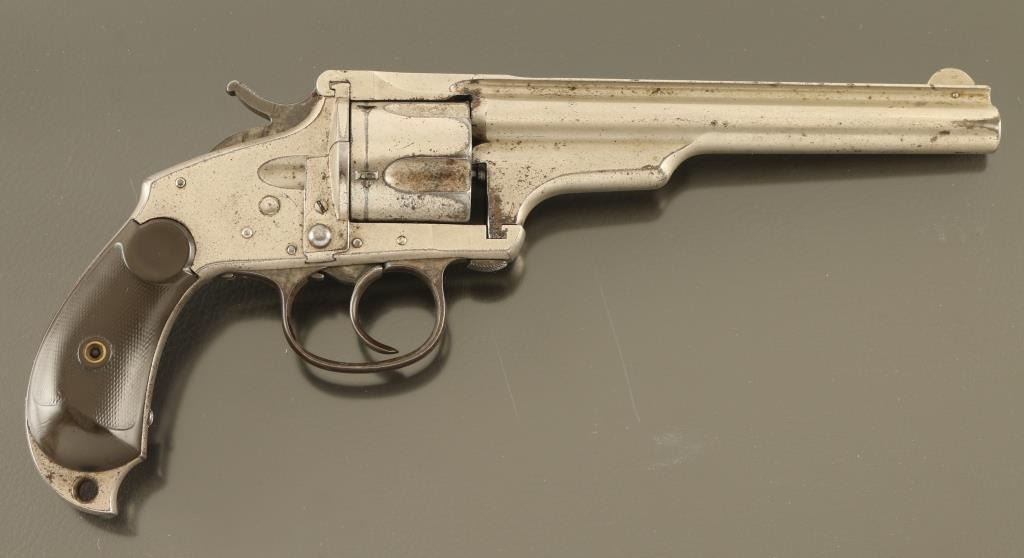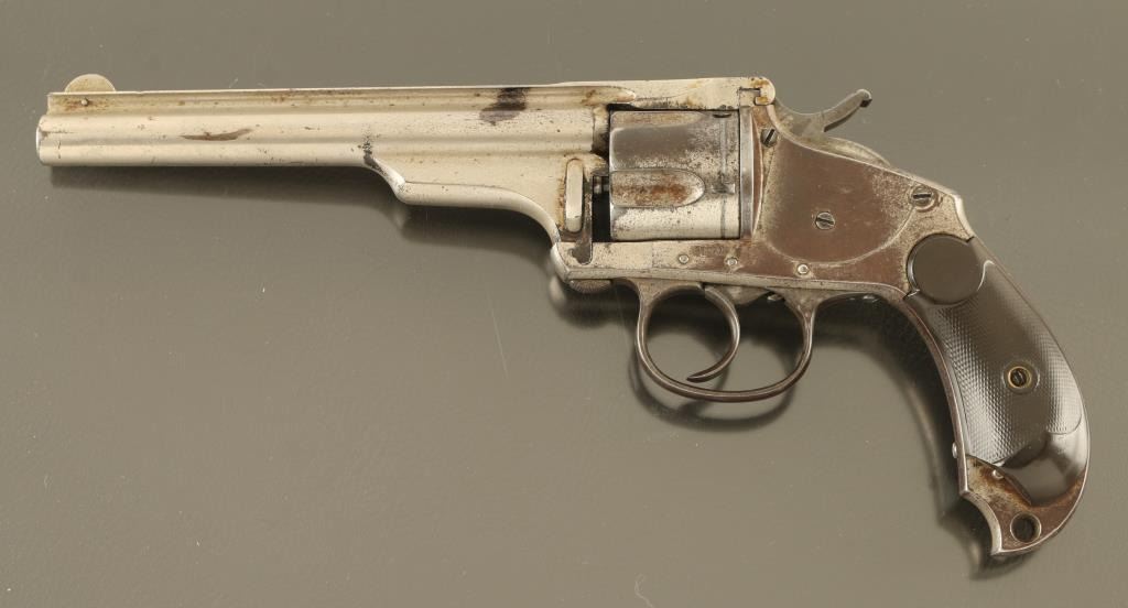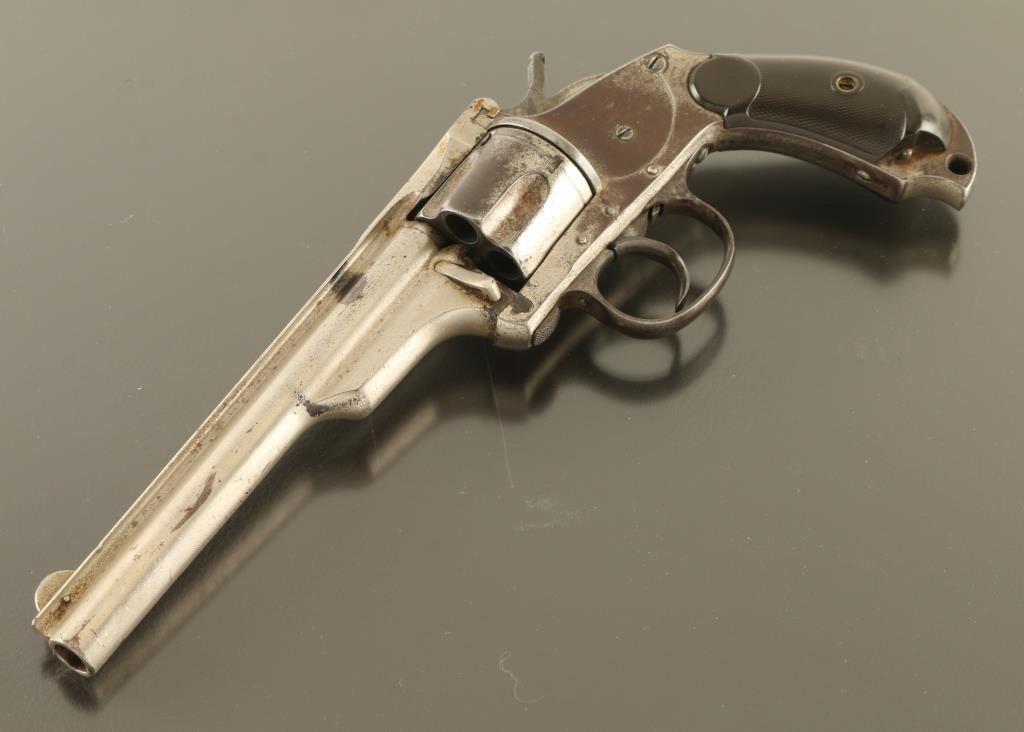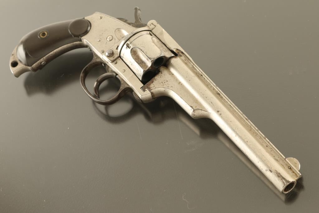 SN: 6404 Double/single action revolver manufactured circa 1880's. Features nickel plated finish, checkered dark brown gutta percha grips, 5.5" barrel, fixed sights, sliding plate loading gate, twist open frame for unloading, bird's head shaped grip frame, "skull crusher" pointed butt with hole for lanyard. Bore is pitted & eroded with fair condition rifling. Retains 50% nickel plate, peeled or chipped away to reveal brown patina in many places. Grips are fair, missing small piece from left side butt. Action operates smoothly, locks up in single action, does not lock cylinder reliably in double action mode. Frame opening for ejection seems to work properly, hammer must be rocked back slightly to allow opening. Markings are crisp edged, some letters affected by tiny pits. Condition is NRA Very Good *** Antique Firearm ***