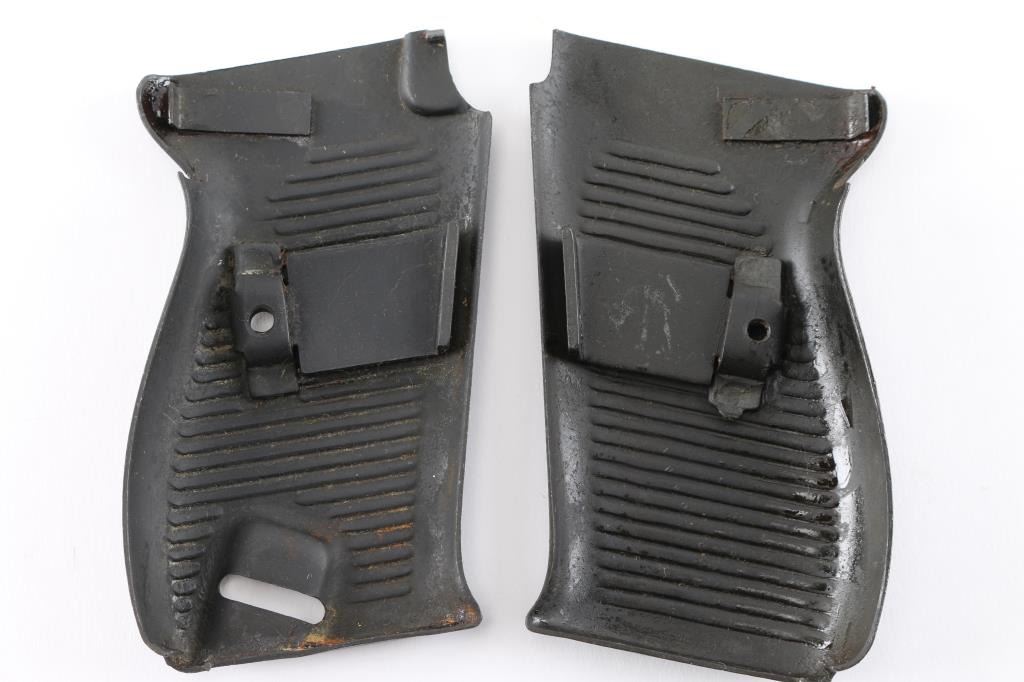 Often mistaken for aluminum, but in fact they are fabricated from steel stampings, used by the Germans on late WWII Mauser P.38s and immediately thereafter by the French on svw-code "Gray Ghost" P.38s assembled at Oberndorf. After the capture of the Mauser factory by Allied troops, the production of the P38 was continued for a while under French occupation for the French army. During that time, the grips became famous for their unique metal design and appearance. These grips are mainly seen on Mauser SVW 46 “French issue” pistols. They also have been reported on some SVW 45 pistols as well. There are no markings which is correct. Excellent condition.
