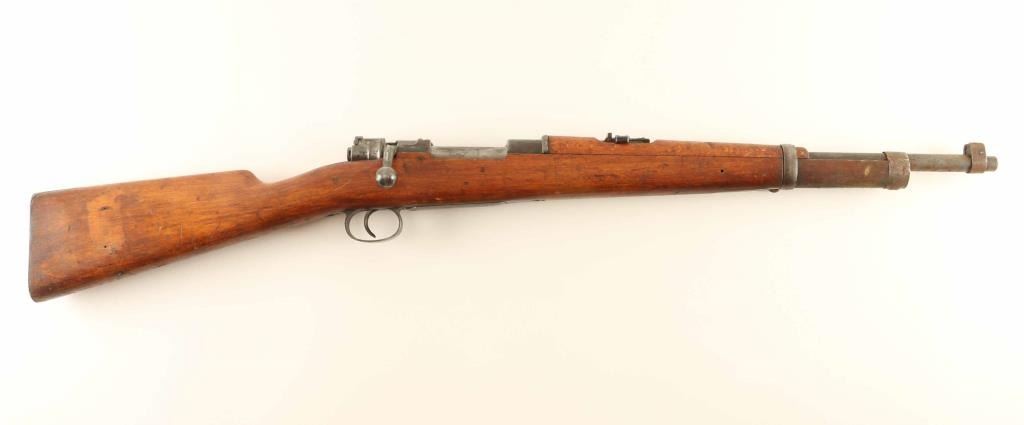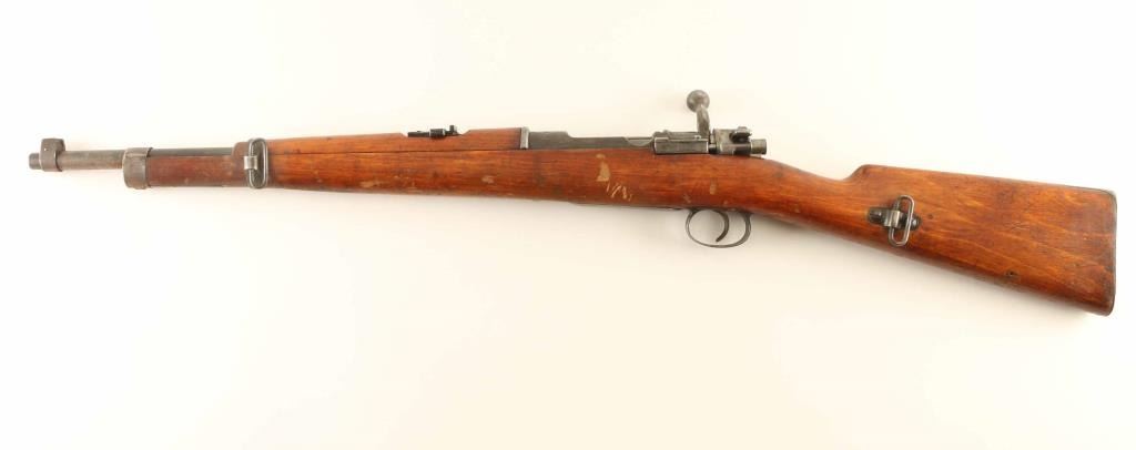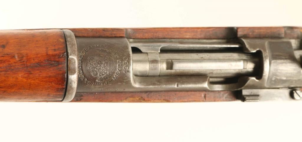 Mexican military rifle chambered for 7x57mm Mauser cartridge. Features side mounted sling swivels, turned down bolt, ladder style rear sight, "wing" style front sight, approx. 18.25 inch barrel. No bayonet lug present, front band has a raised hump at the expected location. Bore is fair condition overall with dark bore and strong rifling, turning to rust the last few inches near muzzle. Visible surface rust from muzzle back to front band, and on bottom of rear band. Remainder of metal is blued, turning plum, with bare metal on sharp edges and on rub areas of bolt. Stock is in good overall condition, has many dents and scuff marks, areas where the wood appears dry with bare wood. Numbers do not match. No import marks observed. Condition is NRA Fair ***C&R Firearm***